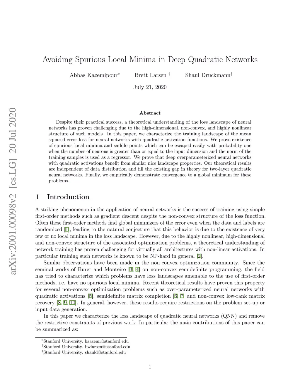 Avoiding Spurious Local Minima in Deep Quadratic Networks