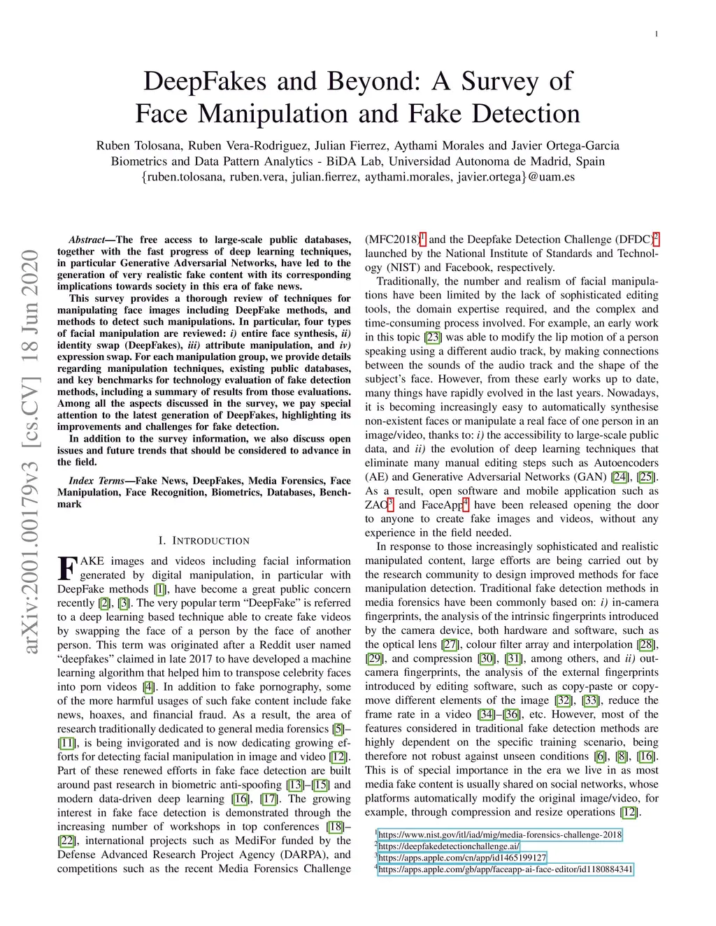 The free access to large-scale public databases, together with the fast progress of deep learning techniques, in particular Generative Adversarial Networks, have led to the generation of very realistic fake content with its corresponding implications towards society in this era of fake news. This survey provides a thorough review of techniques for manipulating face images including DeepFake methods, and methods to detect such manipulations. In particular, four types of facial manipulation are reviewed: i) entire face synthesis, ii) identity swap (DeepFakes), iii) attribute manipulation, and iv) expression swap. For each manipulation group, we provide details regarding manipulation techniques, existing public databases, and key benchmarks for technology evaluation of fake detection methods, including a summary of results from those evaluations. Among all the aspects discussed in the survey, we pay special attention to the latest generation of DeepFakes, highlighting its improvements and challenges for fake detection. In addition to the survey information, we also discuss open issues and future trends that should be considered to advance in the field.