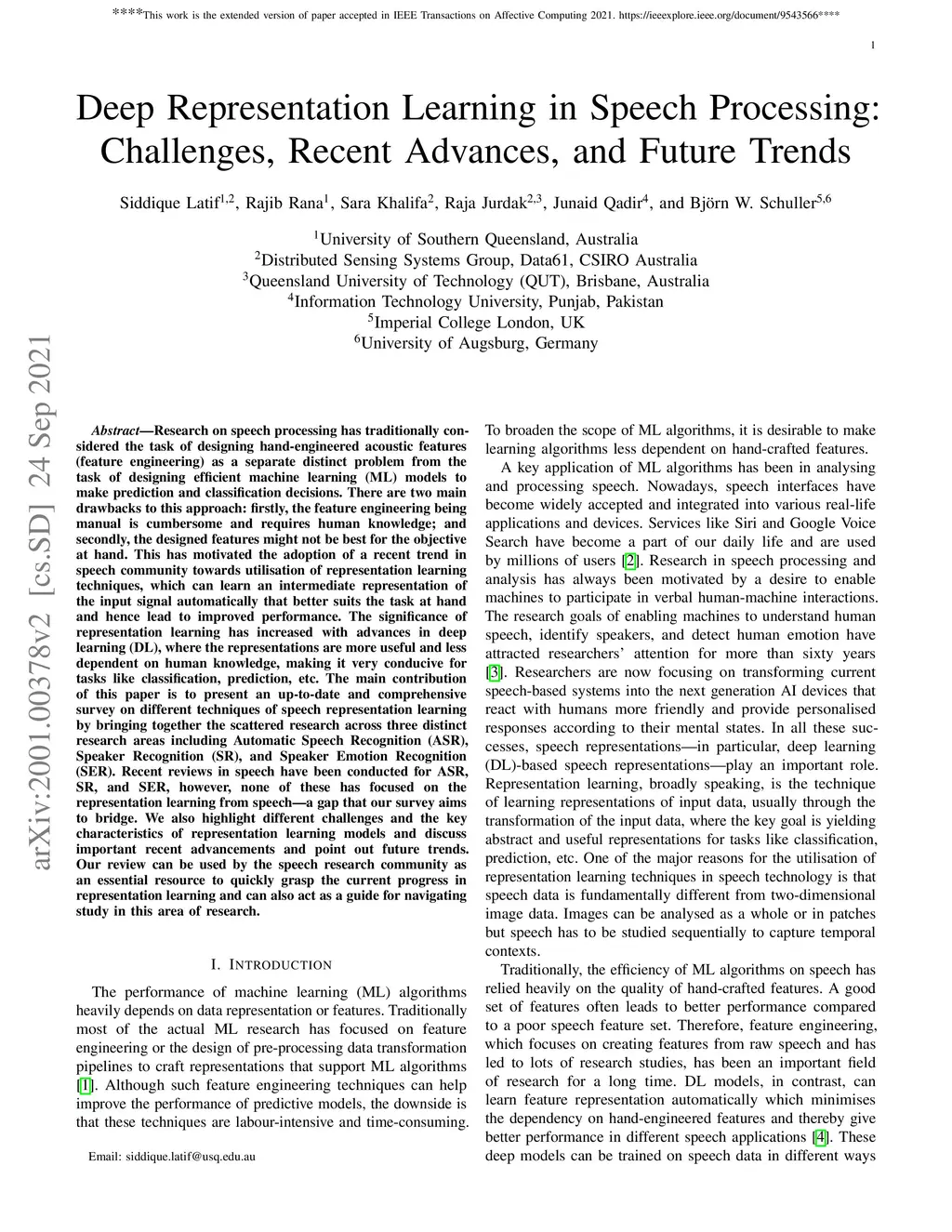 Research on speech processing has traditionally considered the task of designing hand-engineered acoustic features (feature engineering) as a separate distinct problem from the task of designing efficient machine learning (ML) models to make prediction and classification decisions. There are two main drawbacks to this approach: firstly, the feature engineering being manual is cumbersome and requires human knowledge; and secondly, the designed features might not be best for the objective at hand. This has motivated the adoption of a recent trend in speech community towards utilisation of representation learning techniques, which can learn an intermediate representation of the input signal automatically that better suits the task at hand and hence lead to improved performance. The significance of representation learning has increased with advances in deep learning (DL), where the representations are more useful and less dependent on human knowledge, making it very conducive for tasks like classification, prediction, etc. The main contribution of this paper is to present an up-to-date and comprehensive survey on different techniques of speech representation learning by bringing together the scattered research across three distinct research areas including Automatic Speech Recognition (ASR), Speaker Recognition (SR), and Speaker Emotion Recognition (SER). Recent reviews in speech have been conducted for ASR, SR, and SER, however, none of these has focused on the representation learning from speech -- a gap that our survey aims to bridge.