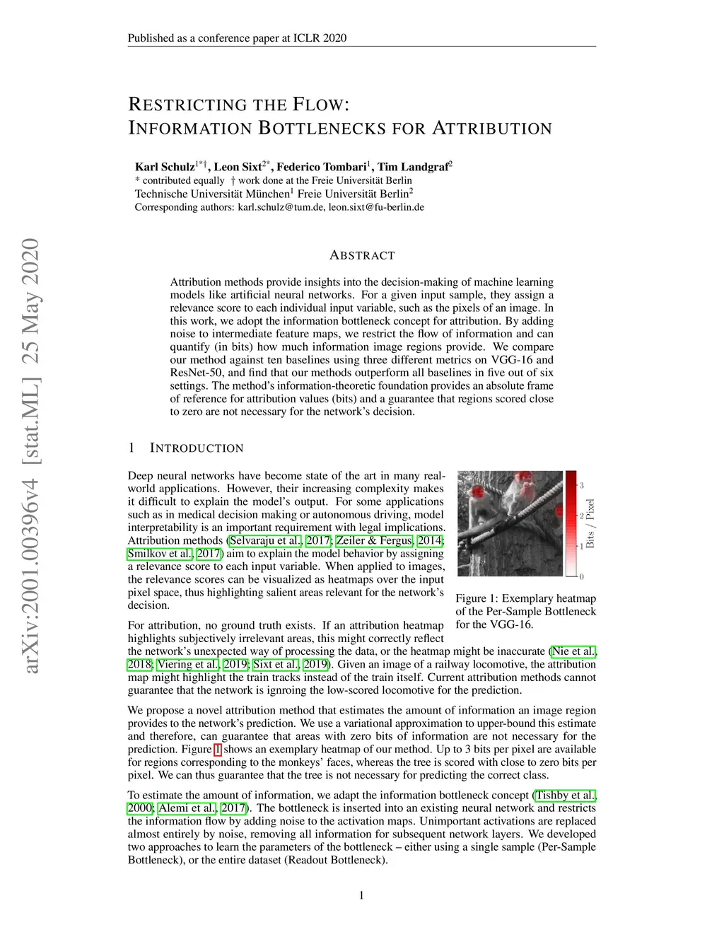 Attribution methods provide insights into the decision-making of machine learning models like artificial neural networks. For a given input sample, they assign a relevance score to each individual input variable, such as the pixels of an image. In this work we adapt the information bottleneck concept for attribution. By adding noise to intermediate feature maps we restrict the flow of information and can quantify (in bits) how much information image regions provide. We compare our method against ten baselines using three different metrics on VGG-16 and ResNet-50, and find that our methods outperform all baselines in five out of six settings. The method's information-theoretic foundation provides an absolute frame of reference for attribution values (bits) and a guarantee that regions scored close to zero are not necessary for the network's decision. For reviews: https://openreview.net/forum?id=S1xWh1rYwB For code: https://github.com/BioroboticsLab/IBA