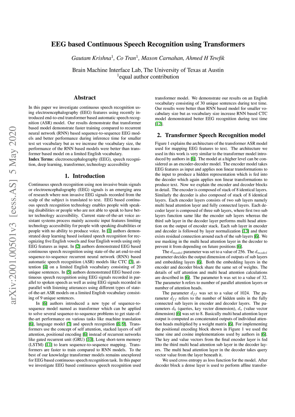 EEG based Continuous Speech Recognition using Transformers