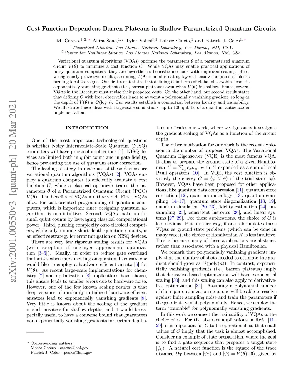 Variational quantum algorithms (VQAs) optimize the parameters of a parametrized quantum circuit to minimize a cost function . While VQAs may enable practical applications of noisy quantum computers, they are nevertheless heuristic methods with unproven scaling. Here, we rigorously prove two results, assuming is an alternating layered ansatz composed of blocks forming local 2-designs. Our first result states that defining in terms of global observables leads to exponentially vanishing gradients (i.e., barren plateaus) even when is shallow. Hence, several VQAs in the literature must revise their proposed costs. On the other hand, our second result states that defining with local observables leads to at worst a polynomially vanishing gradient, so long as the depth of is . Our results establish a connection between locality and trainability. We illustrate these ideas with large-scale simulations, up to 100 qubits, of a quantum autoencoder implementation.