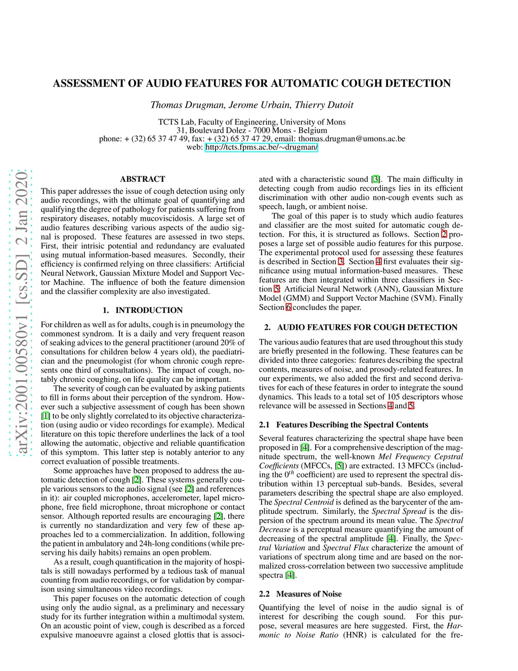 This paper addresses the issue of cough detection using only audio recordings, with the ultimate goal of quantifying and qualifying the degree of pathology for patients suffering from respiratory diseases, notably mucoviscidosis. A large set of audio features describing various aspects of the audio signal is proposed. These features are assessed in two steps. First, their intrisic potential and redundancy are evaluated using mutual information-based measures. Secondly, their efficiency is confirmed relying on three classifiers: Artificial Neural Network, Gaussian Mixture Model and Support Vector Machine. The influence of both the feature dimension and the classifier complexity are also investigated.