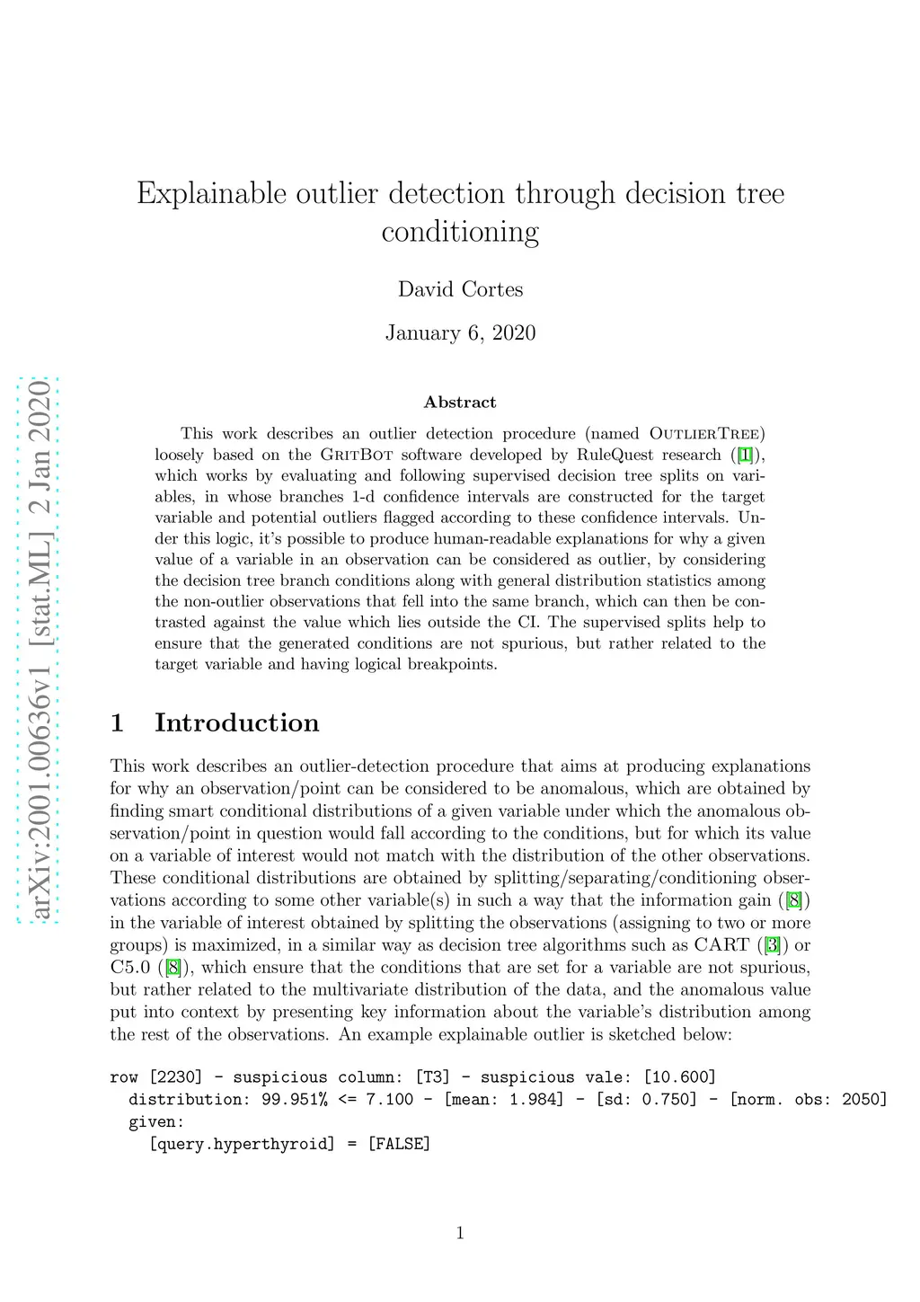 This work describes an outlier detection procedure (named "OutlierTree") loosely based on the GritBot software developed by RuleQuest research, which works by evaluating and following supervised decision tree splits on variables, in whose branches 1-d confidence intervals are constructed for the target variable and potential outliers flagged according to these confidence intervals. Under this logic, it's possible to produce human-readable explanations for why a given value of a variable in an observation can be considered as outlier, by considering the decision tree branch conditions along with general distribution statistics among the non-outlier observations that fell into the same branch, which can then be contrasted against the value which lies outside the CI. The supervised splits help to ensure that the generated conditions are not spurious, but rather related to the target variable and having logical breakpoints.