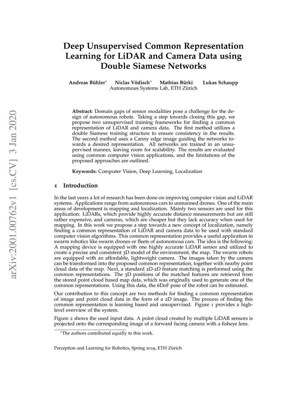 Domain gaps of sensor modalities pose a challenge for the design of autonomous robots. Taking a step towards closing this gap, we propose two unsupervised training frameworks for finding a common representation of LiDAR and camera data. The first method utilizes a double Siamese training structure to ensure consistency in the results. The second method uses a Canny edge image guiding the networks towards a desired representation. All networks are trained in an unsupervised manner, leaving room for scalability. The results are evaluated using common computer vision applications, and the limitations of the proposed approaches are outlined.