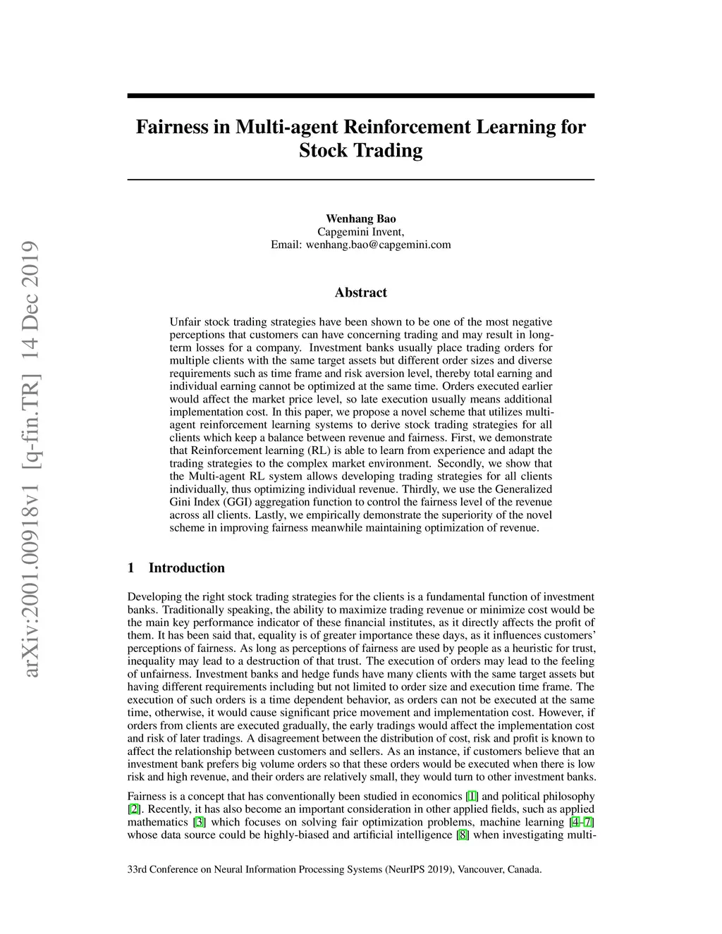 Unfair stock trading strategies have been shown to be one of the most negative perceptions that customers can have concerning trading and may result in long-term losses for a company. Investment banks usually place trading orders for multiple clients with the same target assets but different order sizes and diverse requirements such as time frame and risk aversion level, thereby total earning and individual earning cannot be optimized at the same time. Orders executed earlier would affect the market price level, so late execution usually means additional implementation cost. In this paper, we propose a novel scheme that utilizes multi-agent reinforcement learning systems to derive stock trading strategies for all clients which keep a balance between revenue and fairness. First, we demonstrate that Reinforcement learning (RL) is able to learn from experience and adapt the trading strategies to the complex market environment. Secondly, we show that the Multi-agent RL system allows developing trading strategies for all clients individually, thus optimizing individual revenue. Thirdly, we use the Generalized Gini Index (GGI) aggregation function to control the fairness level of the revenue across all clients. Lastly, we empirically demonstrate the superiority of the novel scheme in improving fairness meanwhile maintaining optimization of revenue.