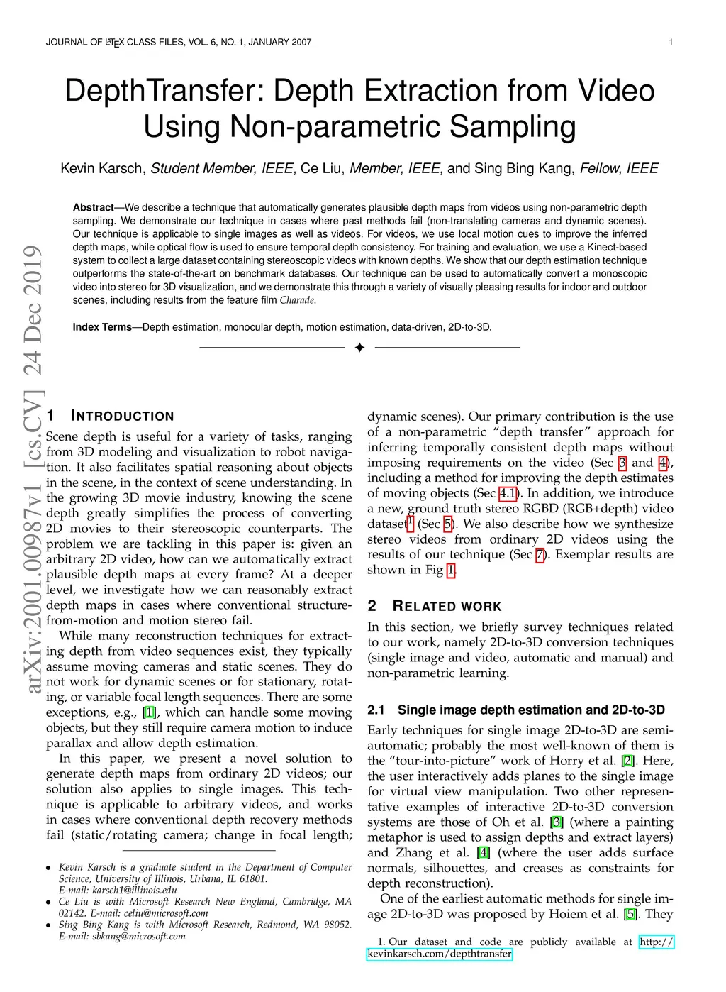 DepthTransfer: Depth Extraction from Video Using Non-parametric Sampling