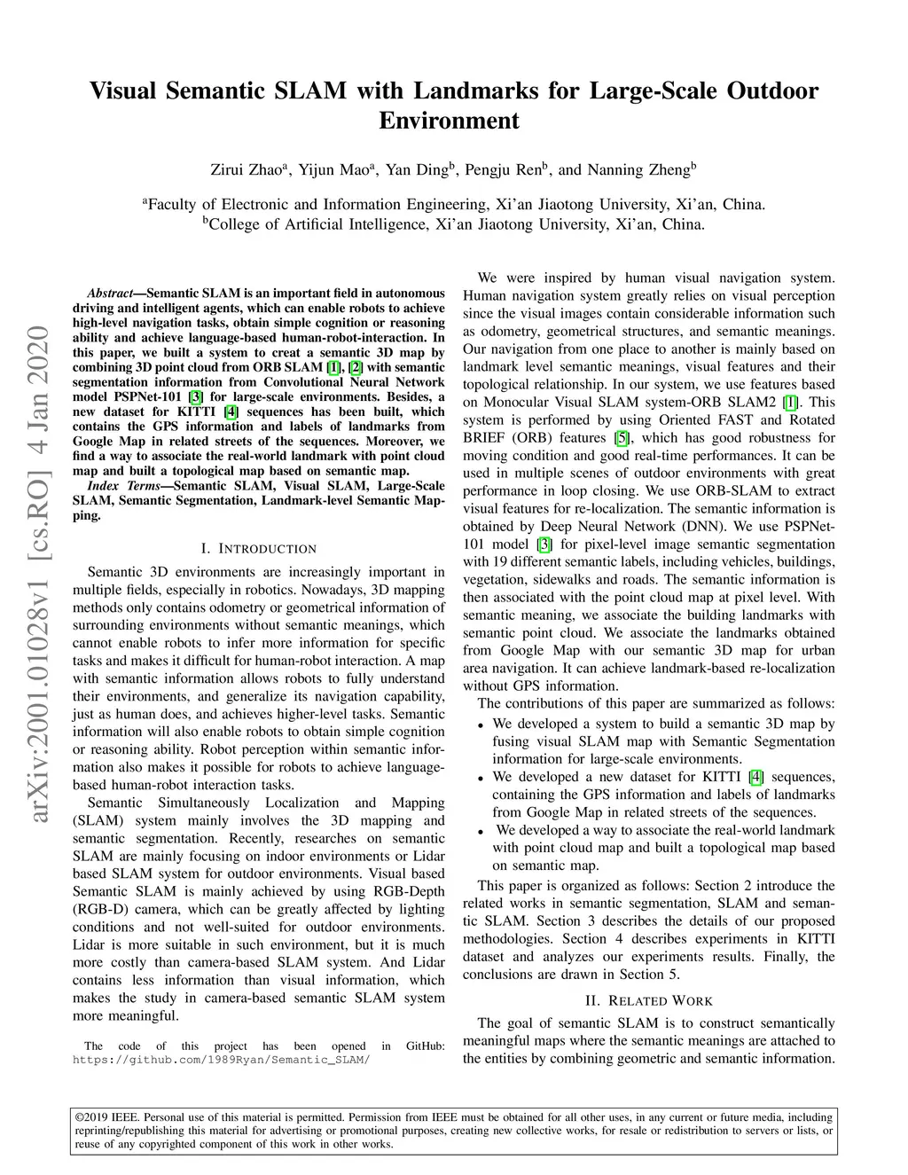 Semantic SLAM is an important field in autonomous driving and intelligent agents, which can enable robots to achieve high-level navigation tasks, obtain simple cognition or reasoning ability and achieve language-based human-robot-interaction. In this paper, we built a system to creat a semantic 3D map by combining 3D point cloud from ORB SLAM with semantic segmentation information from Convolutional Neural Network model PSPNet-101 for large-scale environments. Besides, a new dataset for KITTI sequences has been built, which contains the GPS information and labels of landmarks from Google Map in related streets of the sequences. Moreover, we find a way to associate the real-world landmark with point cloud map and built a topological map based on semantic map.
