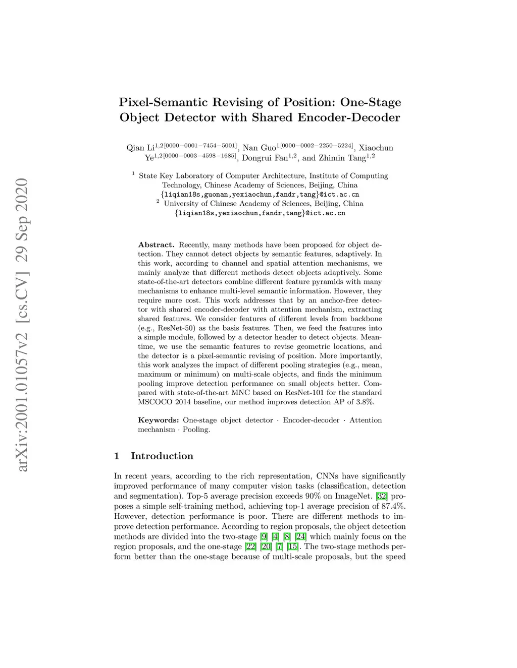 Recently, many methods have been proposed for object detection. They cannot detect objects by semantic features, adaptively. In this work, according to channel and spatial attention mechanisms, we mainly analyze that different methods detect objects adaptively. Some state-of-the-art detectors combine different feature pyramids with many mechanisms to enhance multi-level semantic information. However, they require more cost. This work addresses that by an anchor-free detector with shared encoder-decoder with attention mechanism, extracting shared features. We consider features of different levels from backbone (e.g., ResNet-50) as the basis features. Then, we feed the features into a simple module, followed by a detector header to detect objects. Meantime, we use the semantic features to revise geometric locations, and the detector is a pixel-semantic revising of position. More importantly, this work analyzes the impact of different pooling strategies (e.g., mean, maximum or minimum) on multi-scale objects, and finds the minimum pooling improve detection performance on small objects better. Compared with state-of-the-art MNC based on ResNet-101 for the standard MSCOCO 2014 baseline, our method improves detection AP of 3.8%.