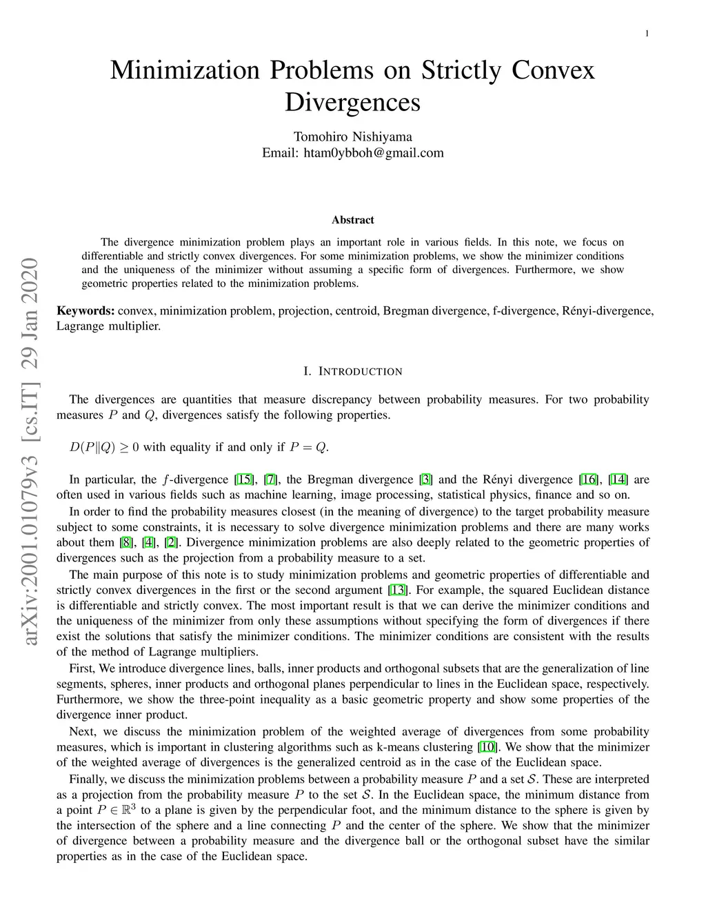 The divergence minimization problem plays an important role in various fields. In this note, we focus on differentiable and strictly convex divergences. For some minimization problems, we show the minimizer conditions and the uniqueness of the minimizer without assuming a specific form of divergences. Furthermore, we show geometric properties related to the minimization problems.
