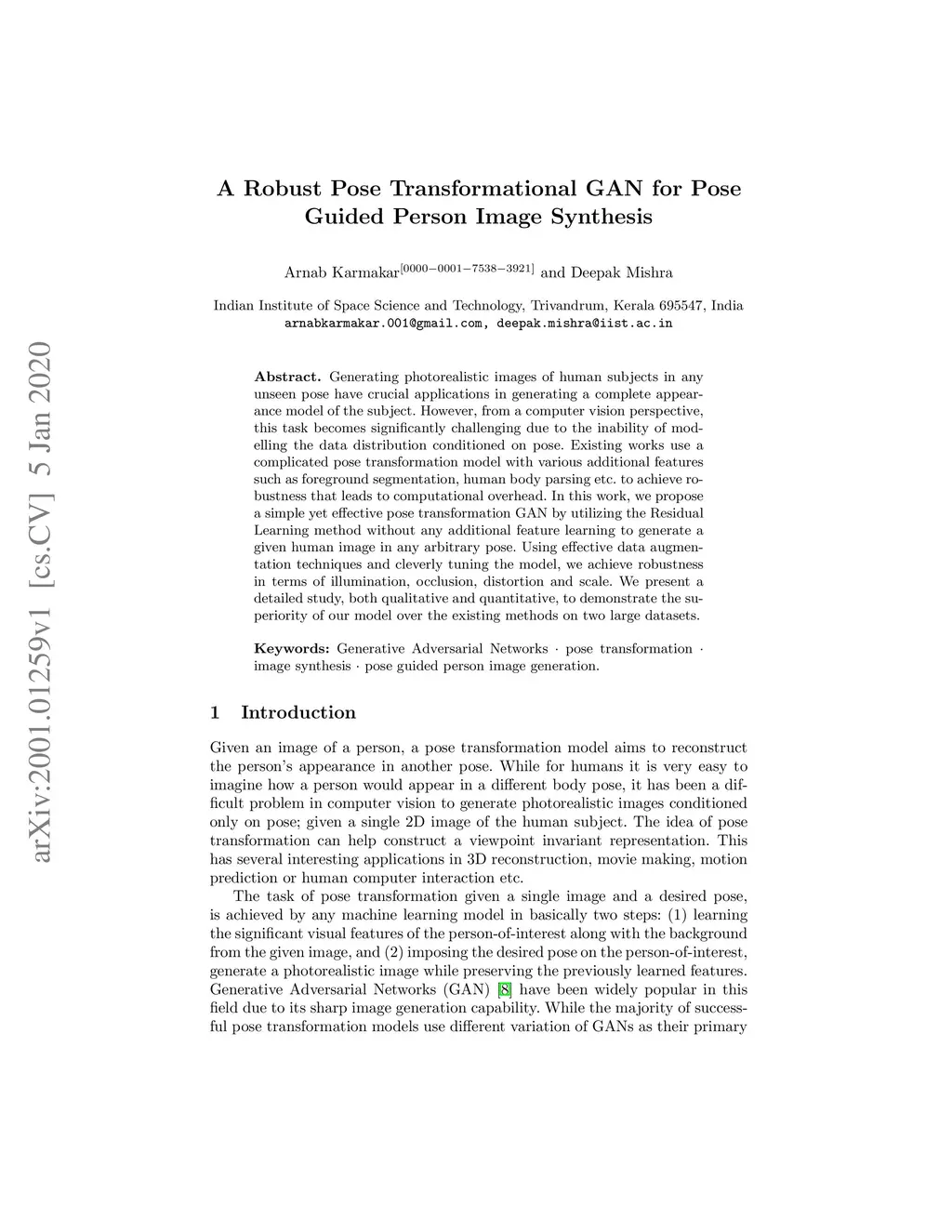 Generating photorealistic images of human subjects in any unseen pose have crucial applications in generating a complete appearance model of the subject. However, from a computer vision perspective, this task becomes significantly challenging due to the inability of modelling the data distribution conditioned on pose. Existing works use a complicated pose transformation model with various additional features such as foreground segmentation, human body parsing etc. to achieve robustness that leads to computational overhead. In this work, we propose a simple yet effective pose transformation GAN by utilizing the Residual Learning method without any additional feature learning to generate a given human image in any arbitrary pose. Using effective data augmentation techniques and cleverly tuning the model, we achieve robustness in terms of illumination, occlusion, distortion and scale. We present a detailed study, both qualitative and quantitative, to demonstrate the superiority of our model over the existing methods on two large datasets.