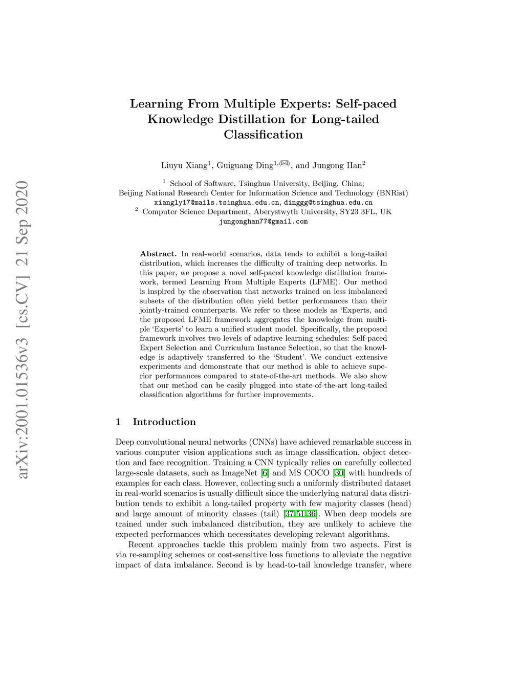 In real-world scenarios, data tends to exhibit a long-tailed distribution, which increases the difficulty of training deep networks. In this paper, we propose a novel self-paced knowledge distillation framework, termed Learning From Multiple Experts (LFME). Our method is inspired by the observation that networks trained on less imbalanced subsets of the distribution often yield better performances than their jointly-trained counterparts. We refer to these models as Éxperts', and the proposed LFME framework aggregates the knowledge from multiple Éxperts' to learn a unified student model. Specifically, the proposed framework involves two levels of adaptive learning schedules: Self-paced Expert Selection and Curriculum Instance Selection, so that the knowledge is adaptively transferred to the 'Student'. We conduct extensive experiments and demonstrate that our method is able to achieve superior performances compared to state-of-the-art methods. We also show that our method can be easily plugged into state-of-the-art long-tailed classification algorithms for further improvements.
