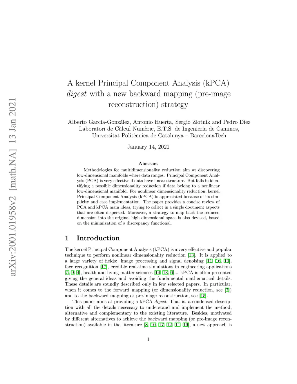 Methodologies for multidimensionality reduction aim at discovering low-dimensional manifolds where data ranges. Principal Component Analysis (PCA) is very effective if data have linear structure. But fails in identifying a possible dimensionality reduction if data belong to a nonlinear low-dimensional manifold. For nonlinear dimensionality reduction, kernel Principal Component Analysis (kPCA) is appreciated because of its simplicity and ease implementation. The paper provides a concise review of PCA and kPCA main ideas, trying to collect in a single document aspects that are often dispersed. Moreover, a strategy to map back the reduced dimension into the original high dimensional space is also devised, based on the minimization of a discrepancy functional.