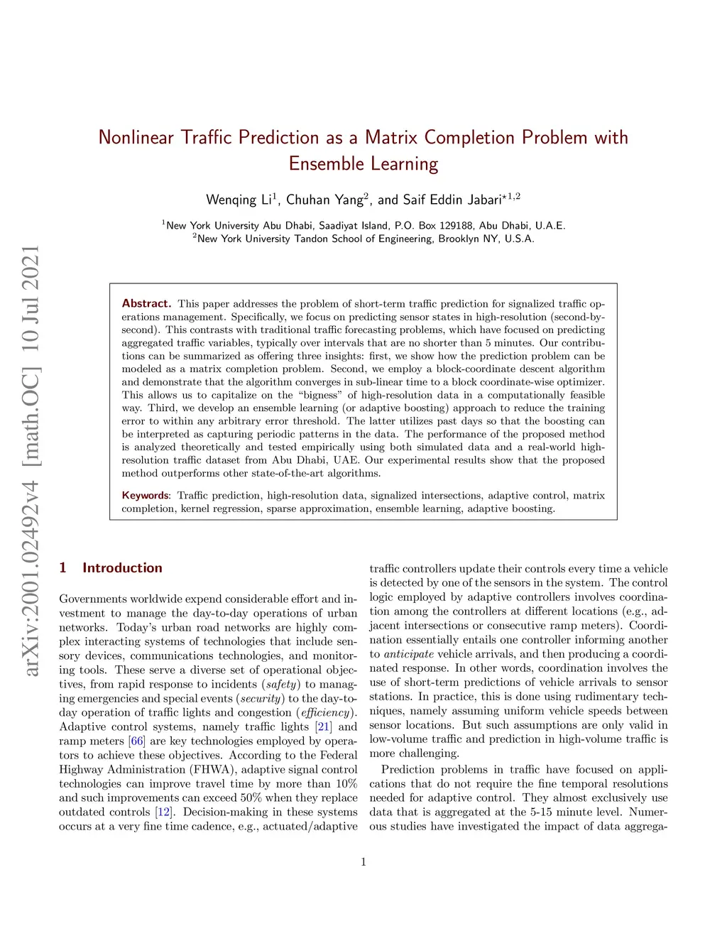 This paper addresses the problem of short-term traffic prediction for signalized traffic operations management. Specifically, we focus on predicting sensor states in high-resolution (second-by-second). This contrasts with traditional traffic forecasting problems, which have focused on predicting aggregated traffic variables, typically over intervals that are no shorter than 5 minutes. Our contributions can be summarized as offering three insights: first, we show how the prediction problem can be modeled as a matrix completion problem. Second, we employ a block-coordinate descent algorithm and demonstrate that the algorithm converges in sub-linear time to a block coordinate-wise optimizer. This allows us to capitalize on the "bigness" of high-resolution data in a computationally feasible way. Third, we develop an ensemble learning (or adaptive boosting) approach to reduce the training error to within any arbitrary error threshold. The latter utilizes past days so that the boosting can be interpreted as capturing periodic patterns in the data. The performance of the proposed method is analyzed theoretically and tested empirically using both simulated data and a real-world high-resolution traffic dataset from Abu Dhabi, UAE. Our experimental results show that the proposed method outperforms other state-of-the-art algorithms.