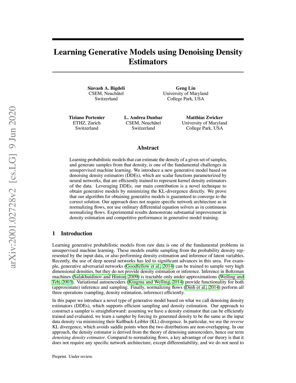 Learning probabilistic models that can estimate the density of a given set of samples, and generate samples from that density, is one of the fundamental challenges in unsupervised machine learning. We introduce a new generative model based on denoising density estimators (DDEs), which are scalar functions parameterized by neural networks, that are efficiently trained to represent kernel density estimators of the data. Leveraging DDEs, our main contribution is a novel technique to obtain generative models by minimizing the KL-divergence directly. We prove that our algorithm for obtaining generative models is guaranteed to converge to the correct solution. Our approach does not require specific network architecture as in normalizing flows, nor use ordinary differential equation solvers as in continuous normalizing flows. Experimental results demonstrate substantial improvement in density estimation and competitive performance in generative model training.