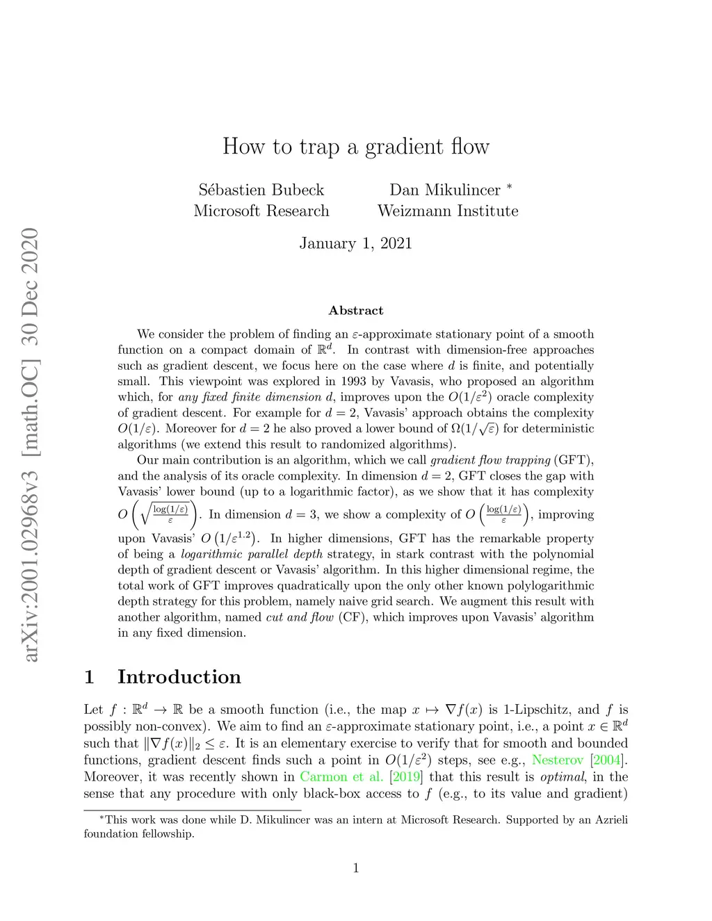 We consider the problem of finding an -approximate stationary point of a smooth function on a compact domain of . In contrast with dimension-free approaches such as gradient descent, we focus here on the case where is finite, and potentially small. This viewpoint was explored in 1993 by Vavasis, who proposed an algorithm which, for any fixed finite dimension , improves upon the oracle complexity of gradient descent. For example for , Vavasis' approach obtains the complexity . Moreover for he also proved a lower bound of for deterministic algorithms (we extend this result to randomized algorithms). Our main contribution is an algorithm, which we call gradient flow trapping (GFT), and the analysis of its oracle complexity. In dimension , GFT closes the gap with Vavasis' lower bound (up to a logarithmic factor), as we show that it has complexity . In dimension , we show a complexity of , improving upon Vavasis' . In higher dimensions, GFT has the remarkable property of being a logarithmic parallel depth strategy, in stark contrast with the polynomial depth of gradient descent or Vavasis' algorithm. In this higher dimensional regime, the total work of GFT improves quadratically upon the only other known polylogarithmic depth strategy for this problem, namely naive grid search. We augment this result with another algorithm, named \emph{cut and flow} (CF), which improves upon Vavasis' algorithm in any fixed dimension.