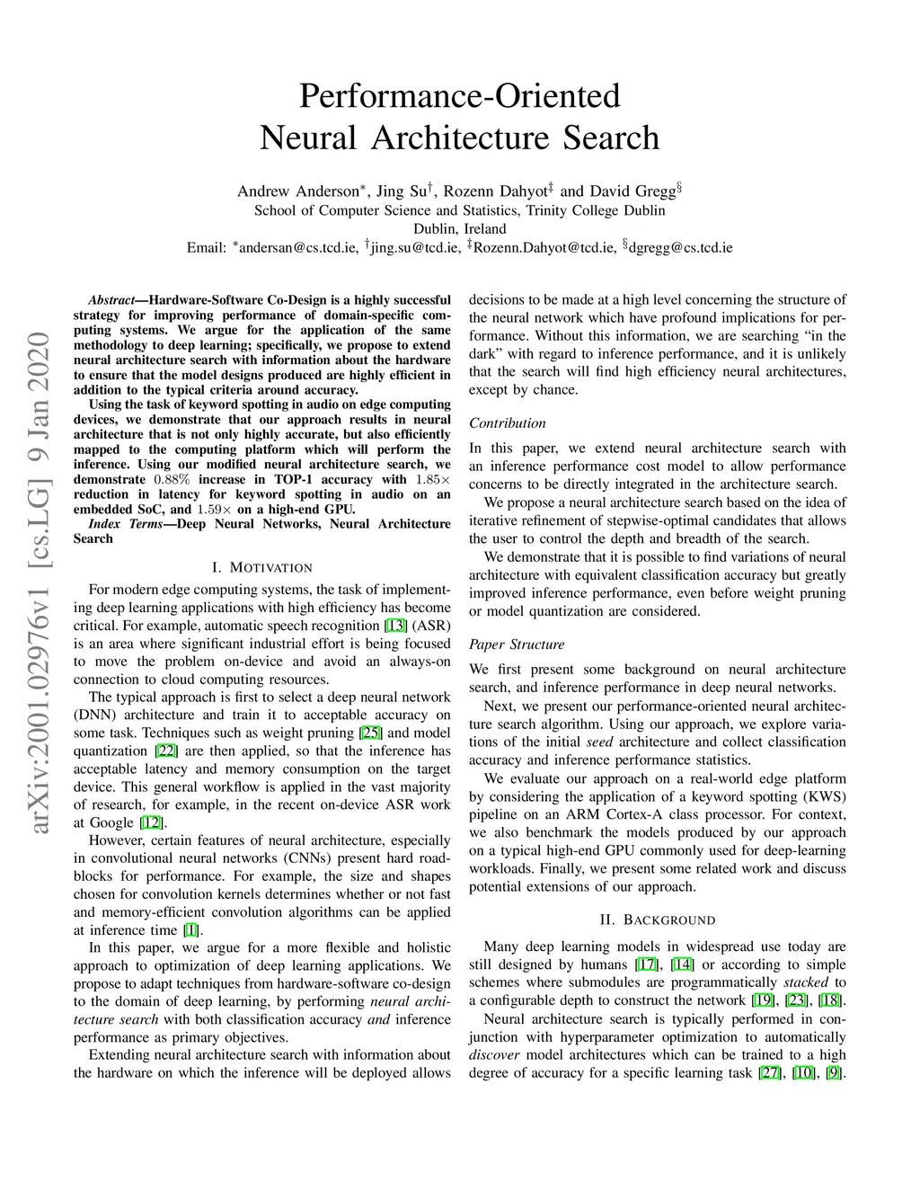 Hardware-Software Co-Design is a highly successful strategy for improving performance of domain-specific computing systems. We argue for the application of the same methodology to deep learning; specifically, we propose to extend neural architecture search with information about the hardware to ensure that the model designs produced are highly efficient in addition to the typical criteria around accuracy. Using the task of keyword spotting in audio on edge computing devices, we demonstrate that our approach results in neural architecture that is not only highly accurate, but also efficiently mapped to the computing platform which will perform the inference. Using our modified neural architecture search, we demonstrate increase in TOP-1 accuracy with reduction in latency for keyword spotting in audio on an embedded SoC, and on a high-end GPU.