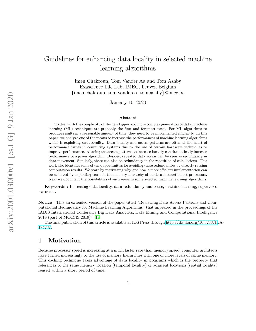 To deal with the complexity of the new bigger and more complex generation of data, machine learning (ML) techniques are probably the first and foremost used. For ML algorithms to produce results in a reasonable amount of time, they need to be implemented efficiently. In this paper, we analyze one of the means to increase the performances of machine learning algorithms which is exploiting data locality. Data locality and access patterns are often at the heart of performance issues in computing systems due to the use of certain hardware techniques to improve performance. Altering the access patterns to increase locality can dramatically increase performance of a given algorithm. Besides, repeated data access can be seen as redundancy in data movement. Similarly, there can also be redundancy in the repetition of calculations. This work also identifies some of the opportunities for avoiding these redundancies by directly reusing computation results. We start by motivating why and how a more efficient implementation can be achieved by exploiting reuse in the memory hierarchy of modern instruction set processors. Next we document the possibilities of such reuse in some selected machine learning algorithms.