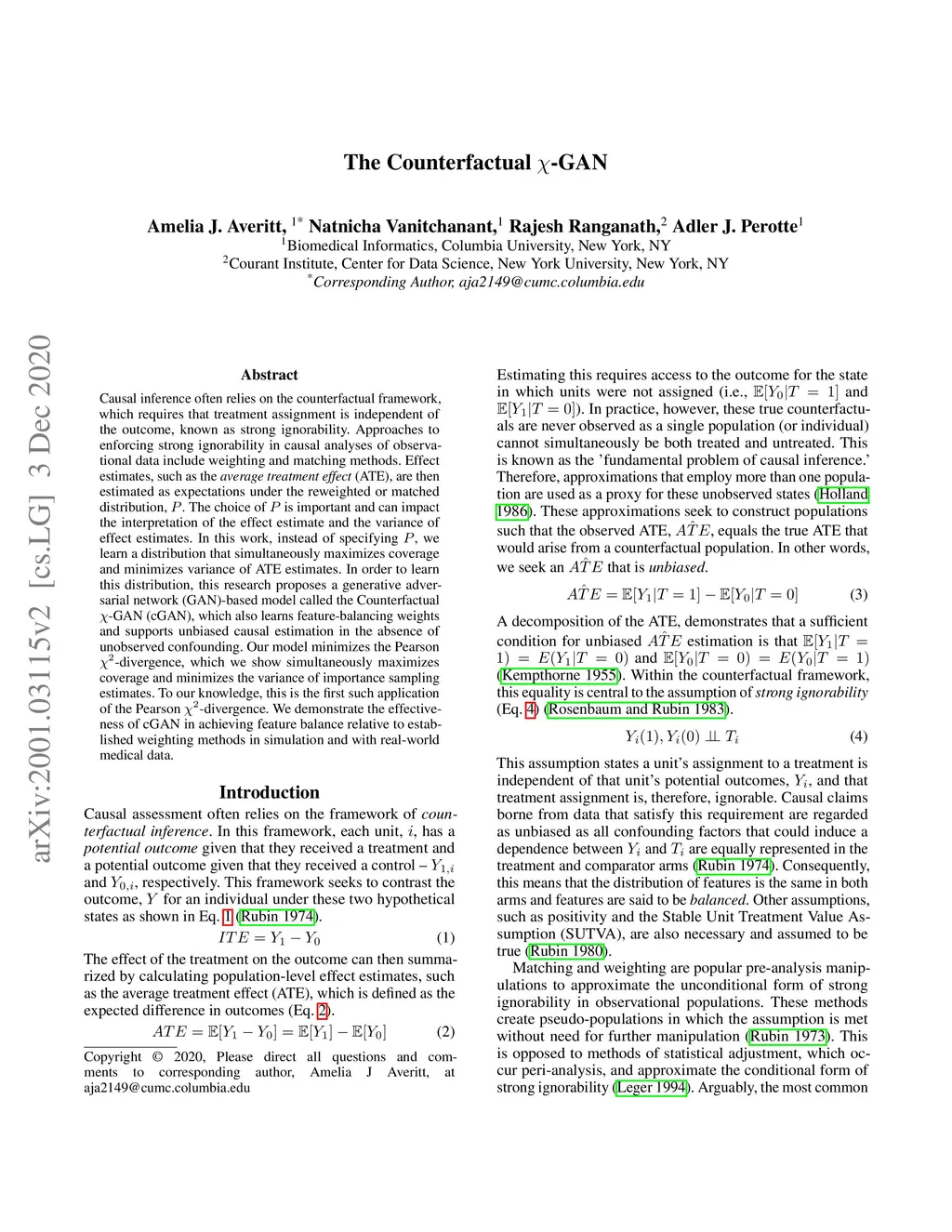 Causal inference often relies on the counterfactual framework, which requires that treatment assignment is independent of the outcome, known as strong ignorability. Approaches to enforcing strong ignorability in causal analyses of observational data include weighting and matching methods. Effect estimates, such as the average treatment effect (ATE), are then estimated as expectations under the reweighted or matched distribution, P . The choice of P is important and can impact the interpretation of the effect estimate and the variance of effect estimates. In this work, instead of specifying P, we learn a distribution that simultaneously maximizes coverage and minimizes variance of ATE estimates. In order to learn this distribution, this research proposes a generative adversarial network (GAN)-based model called the Counterfactual -GAN (cGAN), which also learns feature-balancing weights and supports unbiased causal estimation in the absence of unobserved confounding. Our model minimizes the Pearson divergence, which we show simultaneously maximizes coverage and minimizes the variance of importance sampling estimates. To our knowledge, this is the first such application of the Pearson divergence. We demonstrate the effectiveness of cGAN in achieving feature balance relative to established weighting methods in simulation and with real-world medical data.