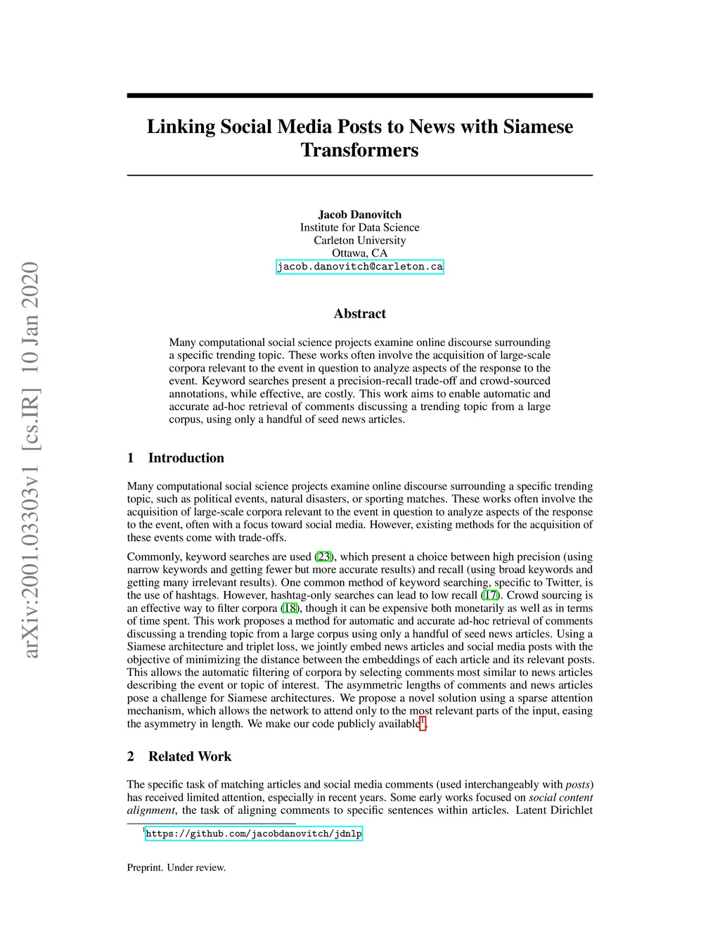 Linking Social Media Posts to News with Siamese Transformers