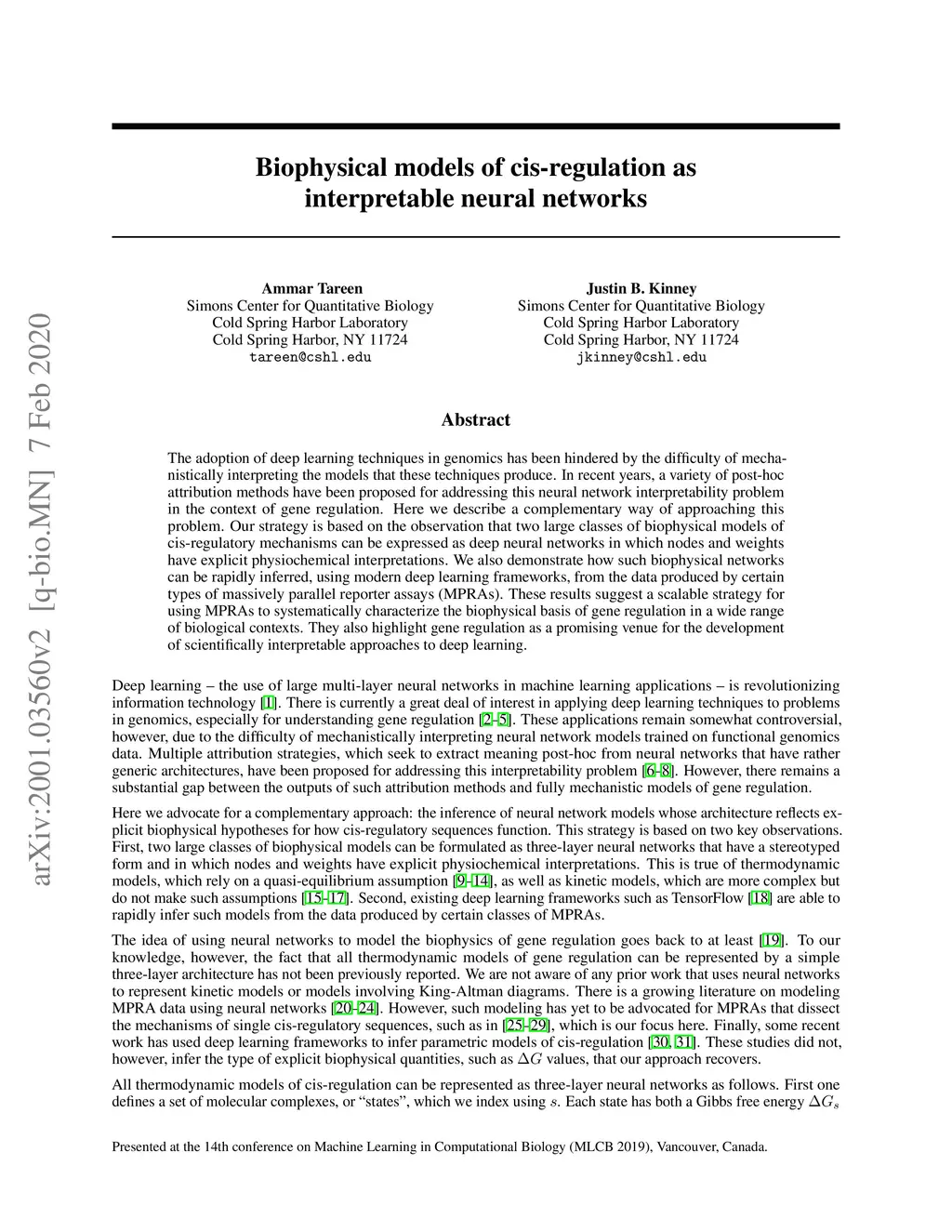 Biophysical models of cis-regulation as interpretable neural networks