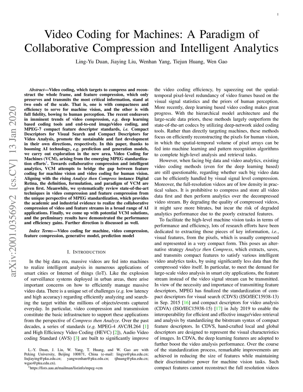 Video coding, which targets to compress and reconstruct the whole frame, and feature compression, which only preserves and transmits the most critical information, stand at two ends of the scale. That is, one is with compactness and efficiency to serve for machine vision, and the other is with full fidelity, bowing to human perception. The recent endeavors in imminent trends of video compression, e.g. deep learning based coding tools and end-to-end image/video coding, and MPEG-7 compact feature descriptor standards, i.e. Compact Descriptors for Visual Search and Compact Descriptors for Video Analysis, promote the sustainable and fast development in their own directions, respectively. In this paper, thanks to booming AI technology, e.g. prediction and generation models, we carry out exploration in the new area, Video Coding for Machines (VCM), arising from the emerging MPEG standardization efforts1. Towards collaborative compression and intelligent analytics, VCM attempts to bridge the gap between feature coding for machine vision and video coding for human vision. Aligning with the rising Analyze then Compress instance Digital Retina, the definition, formulation, and paradigm of VCM are given first. Meanwhile, we systematically review state-of-the-art techniques in video compression and feature compression from the unique perspective of MPEG standardization, which provides the academic and industrial evidence to realize the collaborative compression of video and feature streams in a broad range of AI applications. Finally, we come up with potential VCM solutions, and the preliminary results have demonstrated the performance and efficiency gains. Further direction is discussed as well.