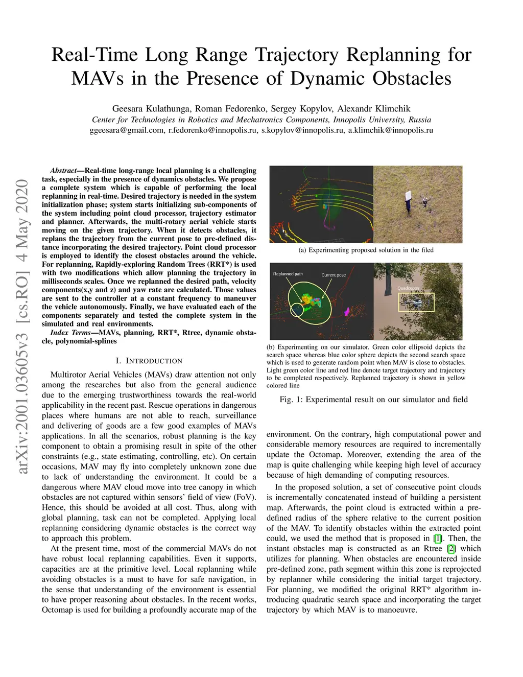Real-time long-range local planning is a challenging task, especially in the presence of dynamics obstacles. We propose a complete system which is capable of performing the local replanning in real-time. Desired trajectory is needed in the system initialization phase; system starts initializing sub-components of the system including point cloud processor, trajectory estimator and planner. Afterwards, the multi-rotary aerial vehicle starts moving on the given trajectory. When it detects obstacles, it replans the trajectory from the current pose to pre-defined distance incorporating the desired trajectory. Point cloud processor is employed to identify the closest obstacles around the vehicle. For replanning, Rapidly-exploring Random Trees (RRT*) is used with two modifications which allow planning the trajectory in milliseconds scales. Once we replanned the desired path, velocity components(x,y and z) and yaw rate are calculated. Those values are sent to the controller at a constant frequency to maneuver the vehicle autonomously. Finally, we have evaluated each of the components separately and tested the complete system in the simulated and real environments.