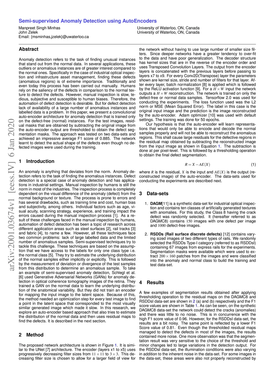 Anomaly detection refers to the task of finding unusual instances that stand out from the normal data. In several applications, these outliers or anomalous instances are of greater interest compared to the normal ones. Specifically in the case of industrial optical inspection and infrastructure asset management, finding these defects (anomalous regions) is of extreme importance. Traditionally and even today this process has been carried out manually. Humans rely on the saliency of the defects in comparison to the normal texture to detect the defects. However, manual inspection is slow, tedious, subjective and susceptible to human biases. Therefore, the automation of defect detection is desirable. But for defect detection lack of availability of a large number of anomalous instances and labelled data is a problem. In this paper, we present a convolutional auto-encoder architecture for anomaly detection that is trained only on the defect-free (normal) instances. For the test images, residual masks that are obtained by subtracting the original image from the auto-encoder output are thresholded to obtain the defect segmentation masks. The approach was tested on two data-sets and achieved an impressive average F1 score of 0.885. The network learnt to detect the actual shape of the defects even though no defected images were used during the training.