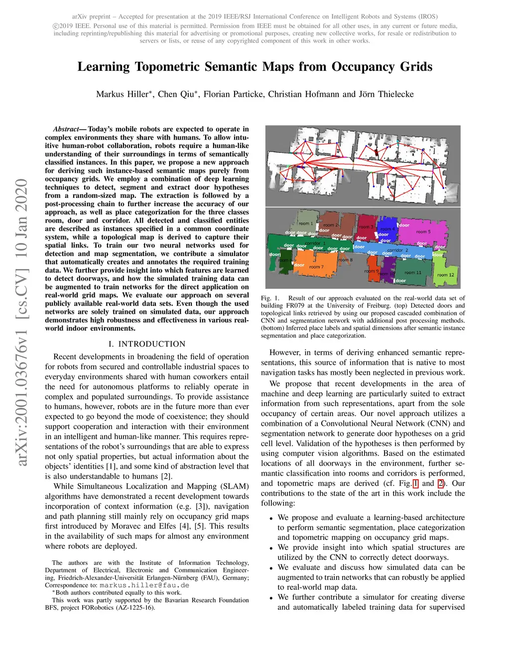 Today's mobile robots are expected to operate in complex environments they share with humans. To allow intuitive human-robot collaboration, robots require a human-like understanding of their surroundings in terms of semantically classified instances. In this paper, we propose a new approach for deriving such instance-based semantic maps purely from occupancy grids. We employ a combination of deep learning techniques to detect, segment and extract door hypotheses from a random-sized map. The extraction is followed by a post-processing chain to further increase the accuracy of our approach, as well as place categorization for the three classes room, door and corridor. All detected and classified entities are described as instances specified in a common coordinate system, while a topological map is derived to capture their spatial links. To train our two neural networks used for detection and map segmentation, we contribute a simulator that automatically creates and annotates the required training data. We further provide insight into which features are learned to detect doorways, and how the simulated training data can be augmented to train networks for the direct application on real-world grid maps. We evaluate our approach on several publicly available real-world data sets. Even though the used networks are solely trained on simulated data, our approach demonstrates high robustness and effectiveness in various real-world indoor environments.