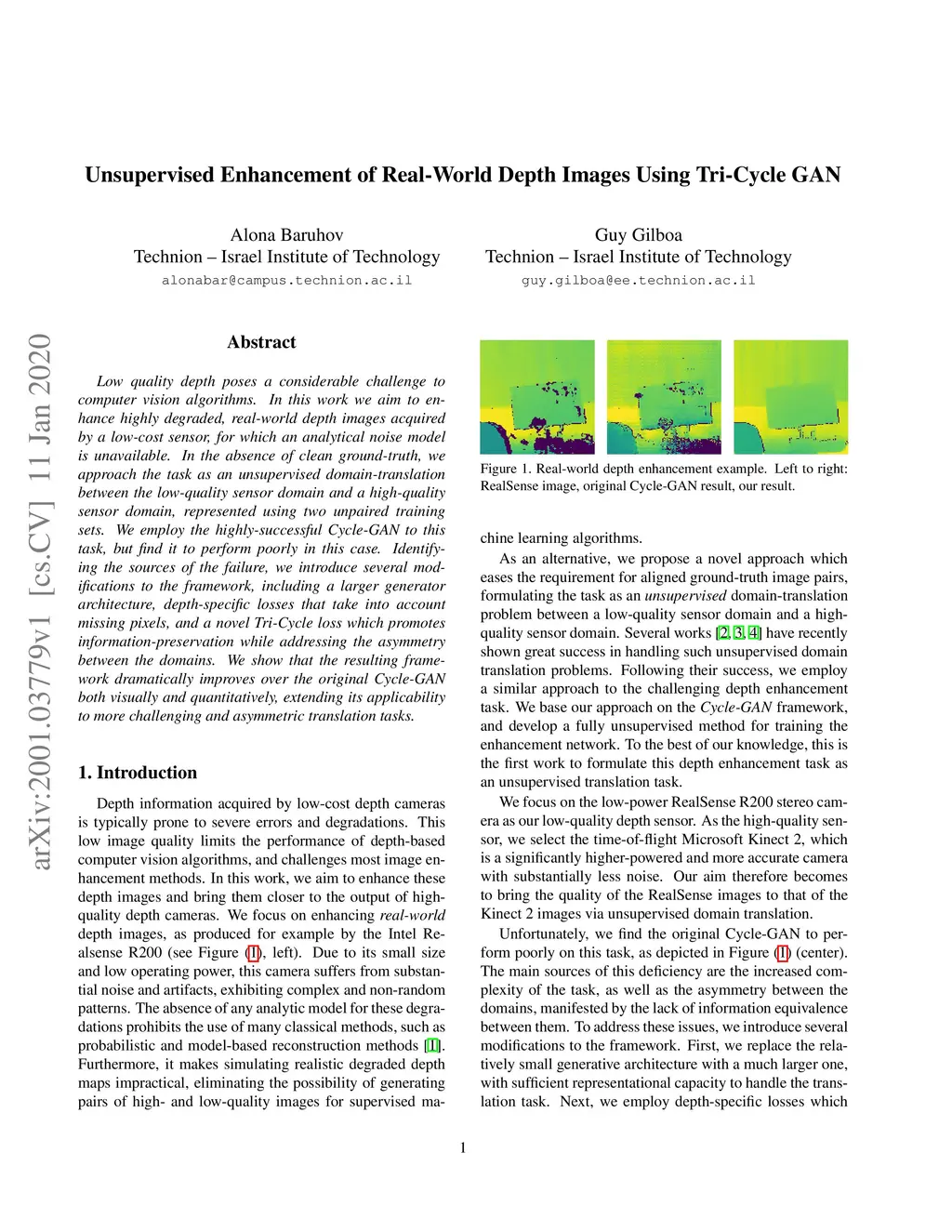 Unsupervised Enhancement of Real-World Depth Images Using Tri-Cycle GAN