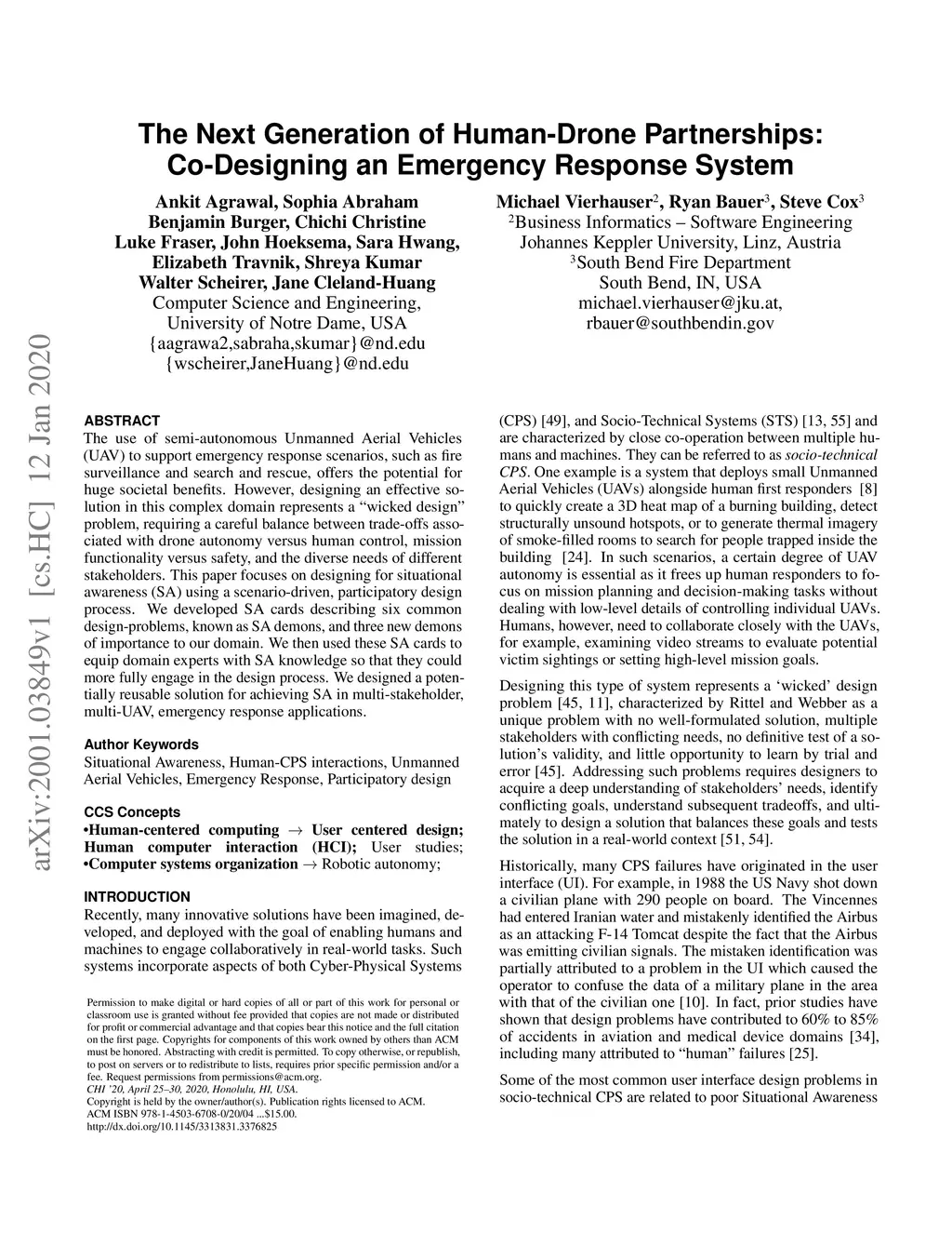 The use of semi-autonomous Unmanned Aerial Vehicles (UAV) to support emergency response scenarios, such as fire surveillance and search and rescue, offers the potential for huge societal benefits. However, designing an effective solution in this complex domain represents a "wicked design" problem, requiring a careful balance between trade-offs associated with drone autonomy versus human control, mission functionality versus safety, and the diverse needs of different stakeholders. This paper focuses on designing for situational awareness (SA) using a scenario-driven, participatory design process. We developed SA cards describing six common design-problems, known as SA demons, and three new demons of importance to our domain. We then used these SA cards to equip domain experts with SA knowledge so that they could more fully engage in the design process. We designed a potentially reusable solution for achieving SA in multi-stakeholder, multi-UAV, emergency response applications.