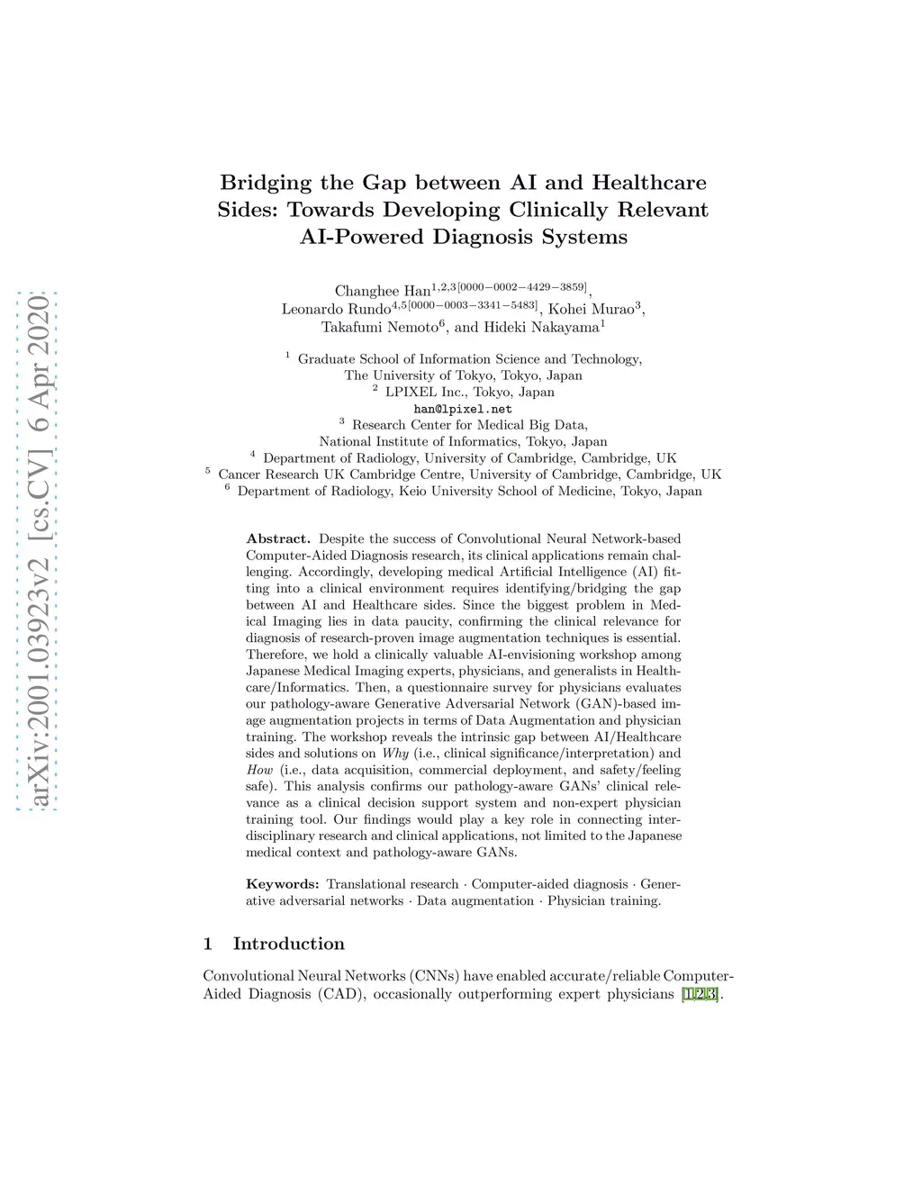 Despite the success of Convolutional Neural Network-based Computer-Aided Diagnosis research, its clinical applications remain challenging. Accordingly, developing medical Artificial Intelligence (AI) fitting into a clinical environment requires identifying/bridging the gap between AI and Healthcare sides. Since the biggest problem in Medical Imaging lies in data paucity, confirming the clinical relevance for diagnosis of research-proven image augmentation techniques is essential. Therefore, we hold a clinically valuable AI-envisioning workshop among Japanese Medical Imaging experts, physicians, and generalists in Healthcare/Informatics. Then, a questionnaire survey for physicians evaluates our pathology-aware Generative Adversarial Network (GAN)-based image augmentation projects in terms of Data Augmentation and physician training. The workshop reveals the intrinsic gap between AI/Healthcare sides and solutions on Why (i.e., clinical significance/interpretation) and How (i.e., data acquisition, commercial deployment, and safety/feeling safe). This analysis confirms our pathology-aware GANs' clinical relevance as a clinical decision support system and non-expert physician training tool. Our findings would play a key role in connecting inter-disciplinary research and clinical applications, not limited to the Japanese medical context and pathology-aware GANs.