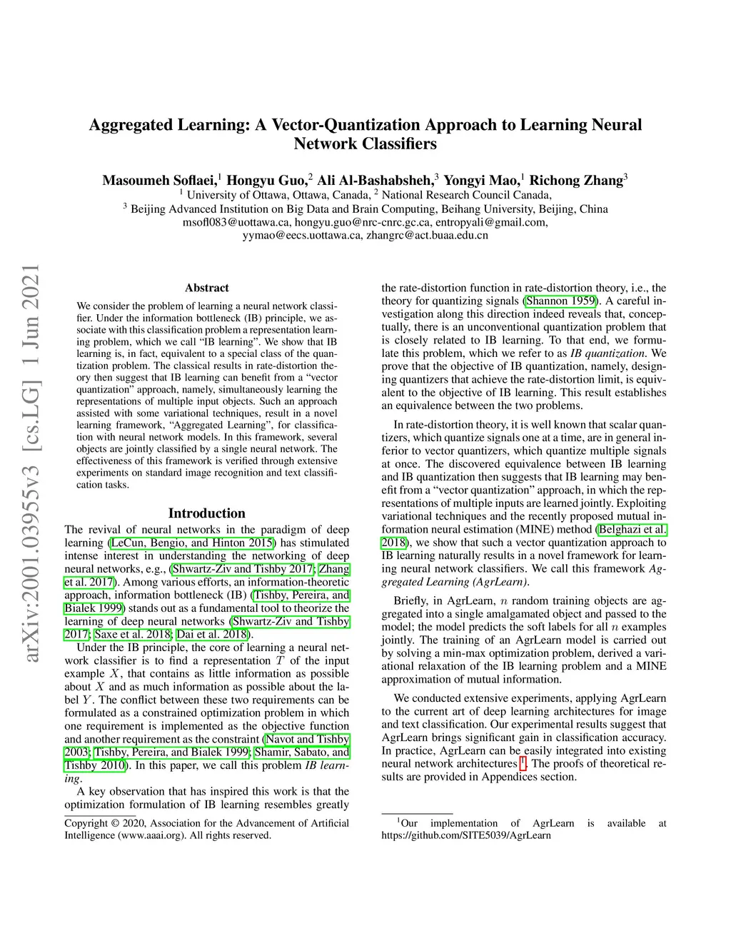 We consider the problem of learning a neural network classifier. Under the information bottleneck (IB) principle, we associate with this classification problem a representation learning problem, which we call "IB learning". We show that IB learning is, in fact, equivalent to a special class of the quantization problem. The classical results in rate-distortion theory then suggest that IB learning can benefit from a "vector quantization" approach, namely, simultaneously learning the representations of multiple input objects. Such an approach assisted with some variational techniques, result in a novel learning framework, "Aggregated Learning", for classification with neural network models. In this framework, several objects are jointly classified by a single neural network. The effectiveness of this framework is verified through extensive experiments on standard image recognition and text classification tasks.