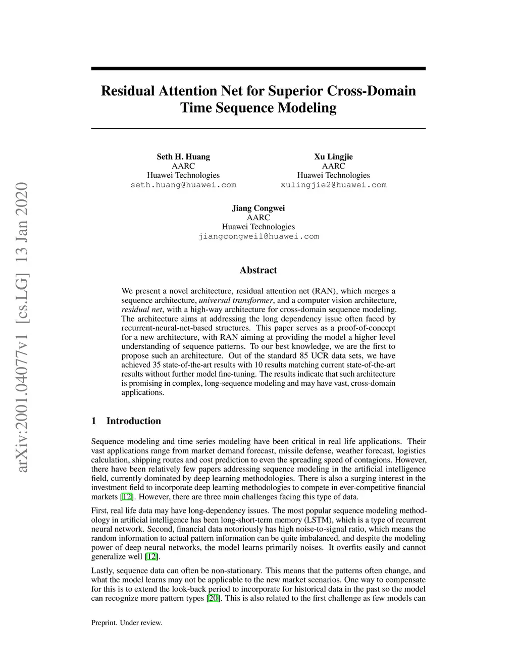 We present a novel architecture, residual attention net (RAN), which merges a sequence architecture, universal transformer, and a computer vision architecture, residual net, with a high-way architecture for cross-domain sequence modeling. The architecture aims at addressing the long dependency issue often faced by recurrent-neural-net-based structures. This paper serves as a proof-of-concept for a new architecture, with RAN aiming at providing the model a higher level understanding of sequence patterns. To our best knowledge, we are the first to propose such an architecture. Out of the standard 85 UCR data sets, we have achieved 35 state-of-the-art results with 10 results matching current state-of-the-art results without further model fine-tuning. The results indicate that such architecture is promising in complex, long-sequence modeling and may have vast, cross-domain applications.