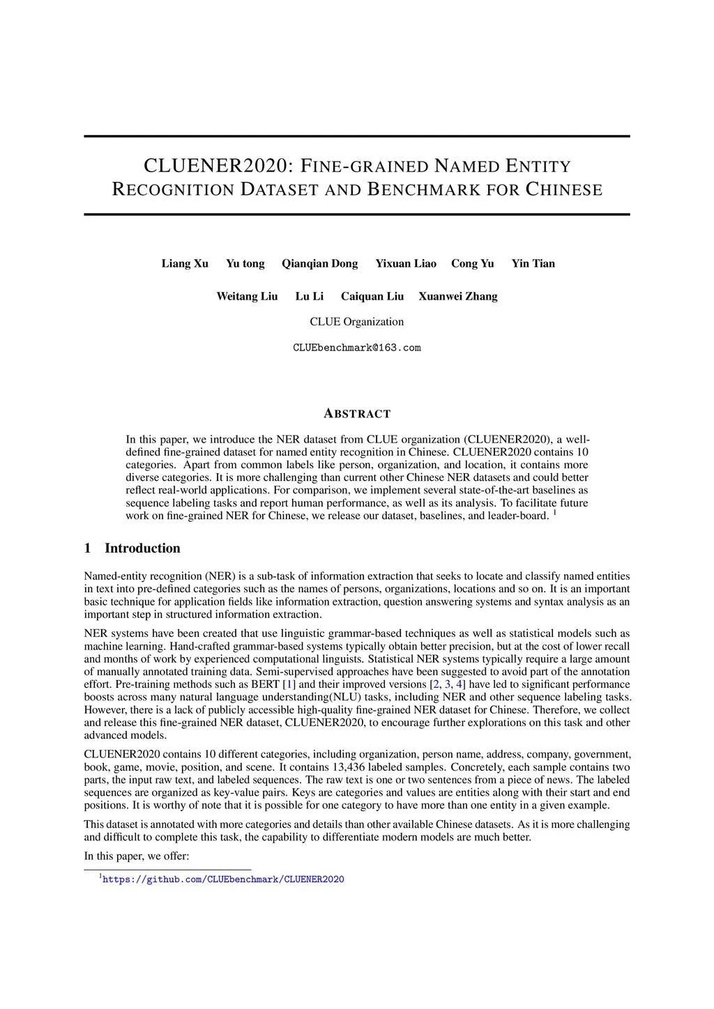 CLUENER2020: Fine-grained Named Entity Recognition Dataset and Benchmark