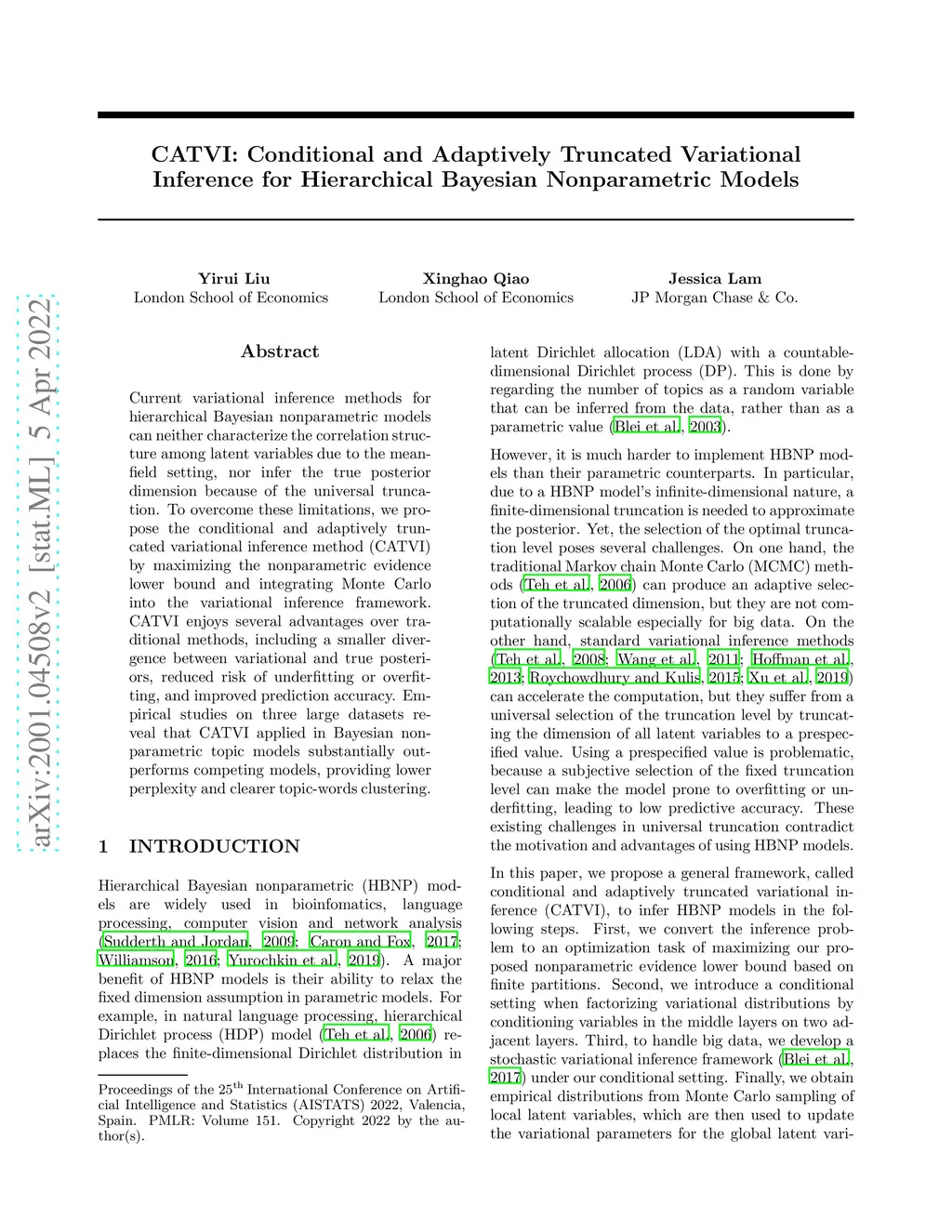 Current variational inference methods for hierarchical Bayesian nonparametric models can neither characterize the correlation structure among latent variables due to the mean-field setting, nor infer the true posterior dimension because of the universal truncation. To overcome these limitations, we propose the conditional and adaptively truncated variational inference method (CATVI) by maximizing the nonparametric evidence lower bound and integrating Monte Carlo into the variational inference framework. CATVI enjoys several advantages over traditional methods, including a smaller divergence between variational and true posteriors, reduced risk of underfitting or overfitting, and improved prediction accuracy. Empirical studies on three large datasets reveal that CATVI applied in Bayesian nonparametric topic models substantially outperforms competing models, providing lower perplexity and clearer topic-words clustering.