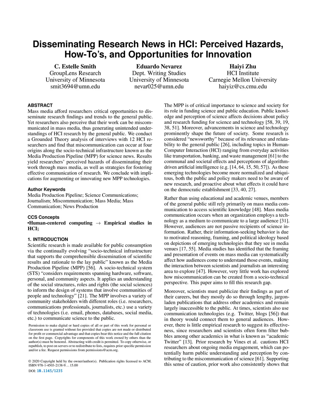 Mass media afford researchers critical opportunities to disseminate research findings and trends to the general public. Yet researchers also perceive that their work can be miscommunicated in mass media, thus generating unintended understandings of HCI research by the general public. We conduct a Grounded Theory analysis of interviews with 12 HCI researchers and find that miscommunication can occur at four origins along the socio-technical infrastructure known as the Media Production Pipeline (MPP) for science news. Results yield researchers' perceived hazards of disseminating their work through mass media, as well as strategies for fostering effective communication of research. We conclude with implications for augmenting or innovating new MPP technologies.