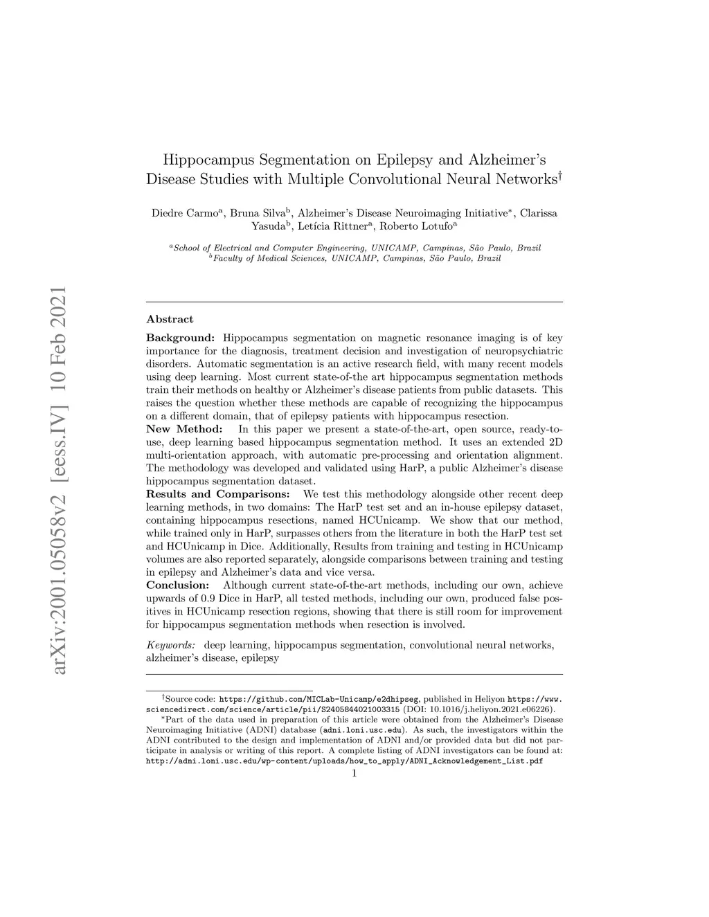 Hippocampus segmentation on magnetic resonance imaging is of key importance for the diagnosis, treatment decision and investigation of neuropsychiatric disorders. Automatic segmentation is an active research field, with many recent models using deep learning. Most current state-of-the art hippocampus segmentation methods train their methods on healthy or Alzheimer's disease patients from public datasets. This raises the question whether these methods are capable of recognizing the hippocampus on a different domain, that of epilepsy patients with hippocampus resection. In this paper we present a state-of-the-art, open source, ready-to-use, deep learning based hippocampus segmentation method. It uses an extended 2D multi-orientation approach, with automatic pre-processing and orientation alignment. The methodology was developed and validated using HarP, a public Alzheimer's disease hippocampus segmentation dataset. We test this methodology alongside other recent deep learning methods, in two domains: The HarP test set and an in-house epilepsy dataset, containing hippocampus resections, named HCUnicamp. We show that our method, while trained only in HarP, surpasses others from the literature in both the HarP test set and HCUnicamp in Dice. Additionally, Results from training and testing in HCUnicamp volumes are also reported separately, alongside comparisons between training and testing in epilepsy and Alzheimer's data and vice versa. Although current state-of-the-art methods, including our own, achieve upwards of 0.9 Dice in HarP, all tested methods, including our own, produced false positives in HCUnicamp resection regions, showing that there is still room for improvement for hippocampus segmentation methods when resection is involved.