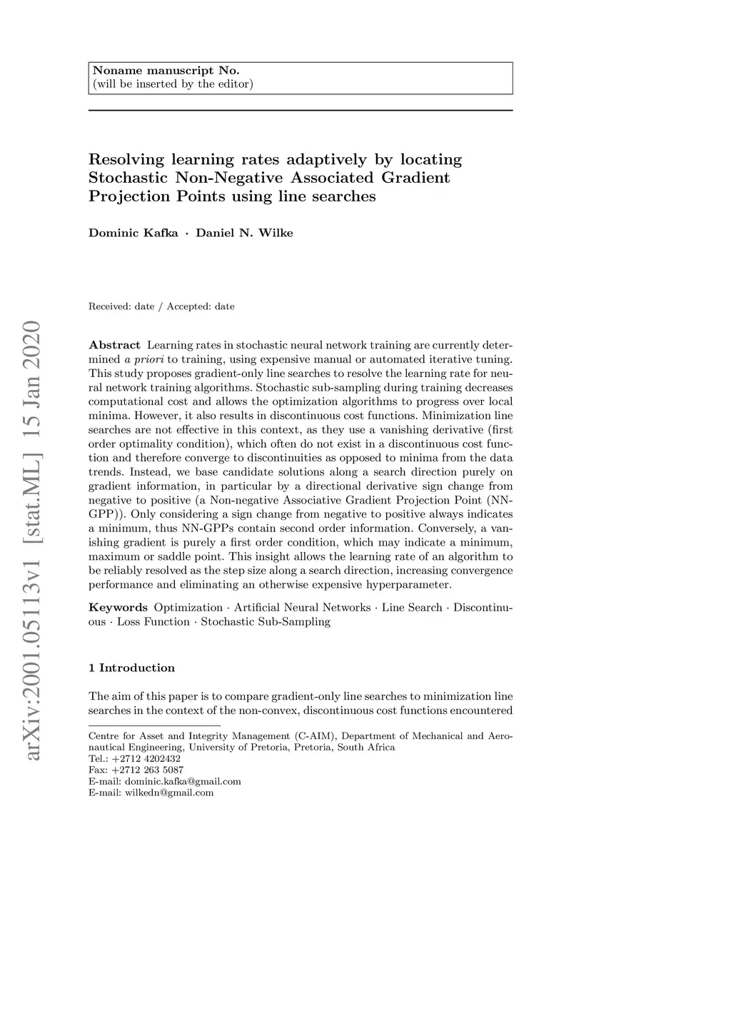Learning rates in stochastic neural network training are currently determined a priori to training, using expensive manual or automated iterative tuning. This study proposes gradient-only line searches to resolve the learning rate for neural network training algorithms. Stochastic sub-sampling during training decreases computational cost and allows the optimization algorithms to progress over local minima. However, it also results in discontinuous cost functions. Minimization line searches are not effective in this context, as they use a vanishing derivative (first order optimality condition), which often do not exist in a discontinuous cost function and therefore converge to discontinuities as opposed to minima from the data trends. Instead, we base candidate solutions along a search direction purely on gradient information, in particular by a directional derivative sign change from negative to positive (a Non-negative Associative Gradient Projection Point (NN- GPP)). Only considering a sign change from negative to positive always indicates a minimum, thus NN-GPPs contain second order information. Conversely, a vanishing gradient is purely a first order condition, which may indicate a minimum, maximum or saddle point. This insight allows the learning rate of an algorithm to be reliably resolved as the step size along a search direction, increasing convergence performance and eliminating an otherwise expensive hyperparameter.