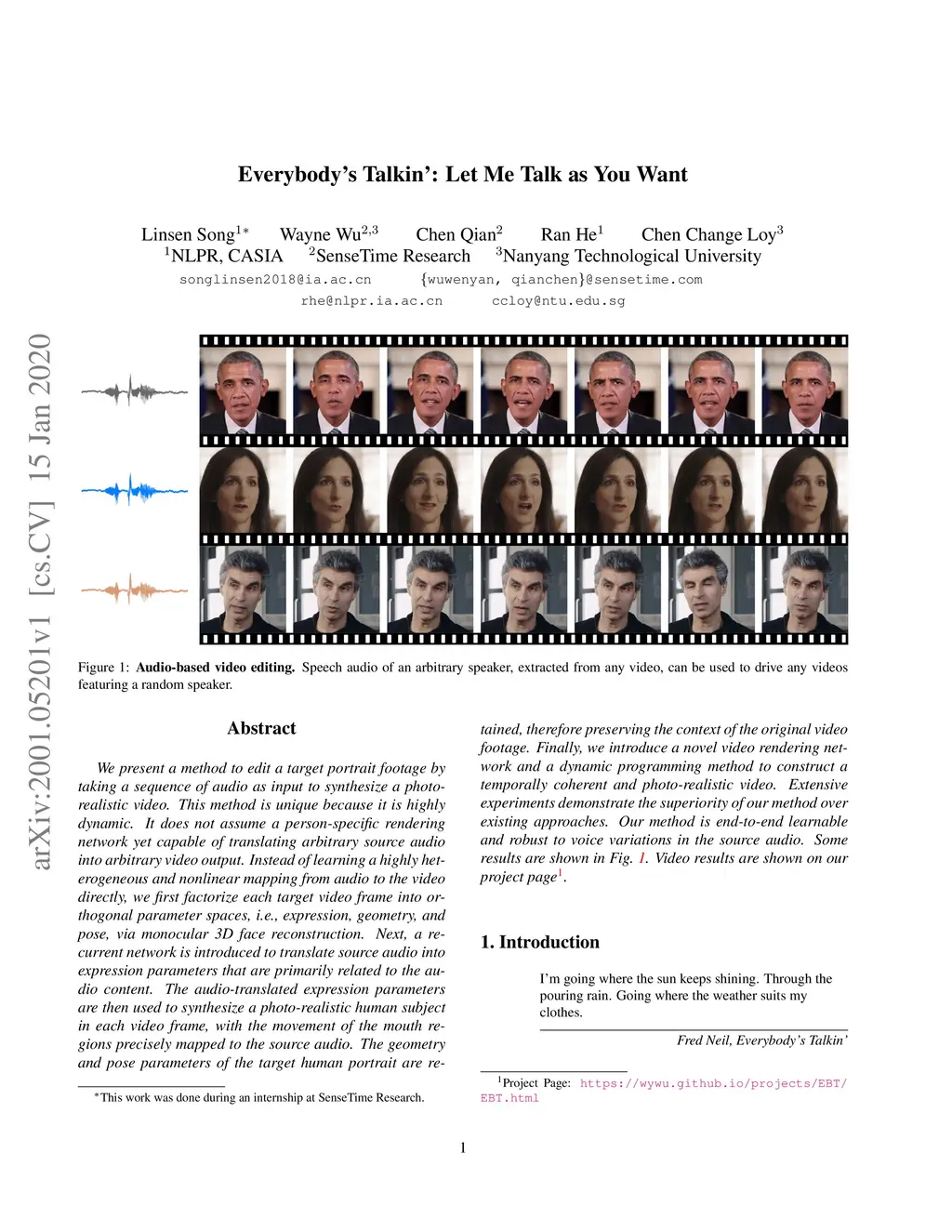 We present a method to edit a target portrait footage by taking a sequence of audio as input to synthesize a photo-realistic video. This method is unique because it is highly dynamic. It does not assume a person-specific rendering network yet capable of translating arbitrary source audio into arbitrary video output. Instead of learning a highly heterogeneous and nonlinear mapping from audio to the video directly, we first factorize each target video frame into orthogonal parameter spaces, i.e., expression, geometry, and pose, via monocular 3D face reconstruction. Next, a recurrent network is introduced to translate source audio into expression parameters that are primarily related to the audio content. The audio-translated expression parameters are then used to synthesize a photo-realistic human subject in each video frame, with the movement of the mouth regions precisely mapped to the source audio. The geometry and pose parameters of the target human portrait are retained, therefore preserving the context of the original video footage. Finally, we introduce a novel video rendering network and a dynamic programming method to construct a temporally coherent and photo-realistic video. Extensive experiments demonstrate the superiority of our method over existing approaches. Our method is end-to-end learnable and robust to voice variations in the source audio.