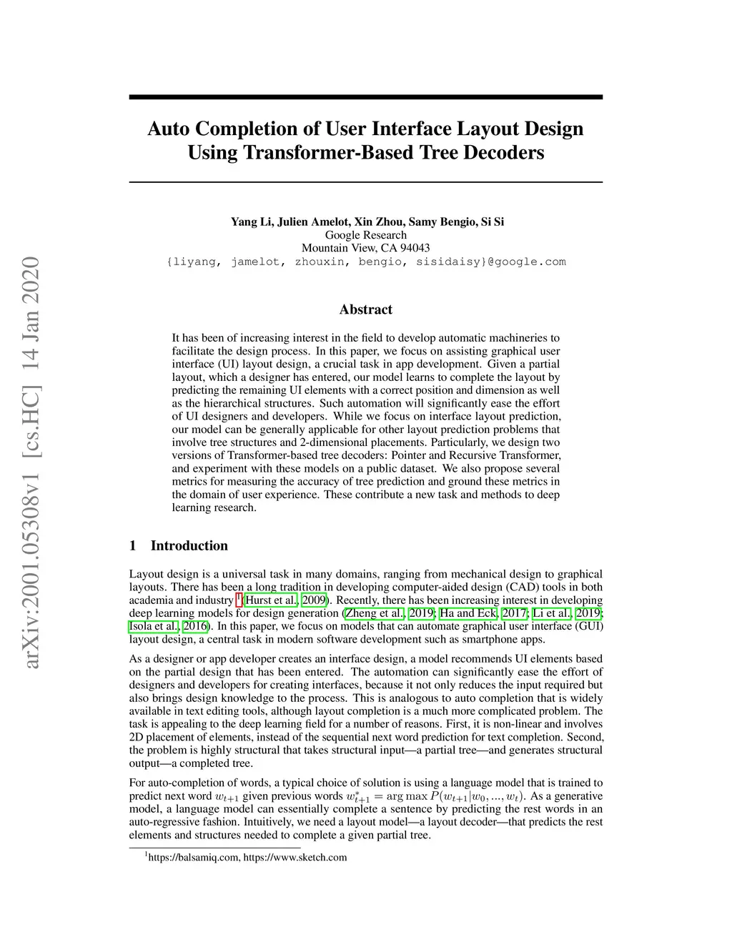 Auto Completion of User Interface Layout Design Using Transformer-Based