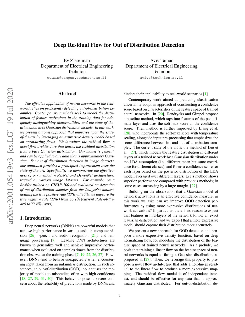 The effective application of neural networks in the real-world relies on proficiently detecting out-of-distribution examples. Contemporary methods seek to model the distribution of feature activations in the training data for adequately distinguishing abnormalities, and the state-of-the-art method uses Gaussian distribution models. In this work, we present a novel approach that improves upon the state-of-the-art by leveraging an expressive density model based on normalizing flows. We introduce the residual flow, a novel flow architecture that learns the residual distribution from a base Gaussian distribution. Our model is general, and can be applied to any data that is approximately Gaussian. For out of distribution detection in image datasets, our approach provides a principled improvement over the state-of-the-art. Specifically, we demonstrate the effectiveness of our method in ResNet and DenseNet architectures trained on various image datasets. For example, on a ResNet trained on CIFAR-100 and evaluated on detection of out-of-distribution samples from the ImageNet dataset, holding the true positive rate (TPR) at , we improve the true negative rate (TNR) from (current state-of-the-art) to (ours).