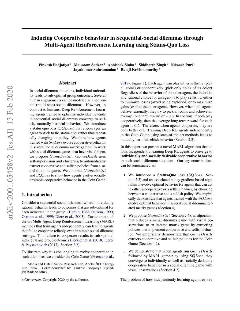 Multi-Agent Reinforcement Learning using Status-Quo Loss