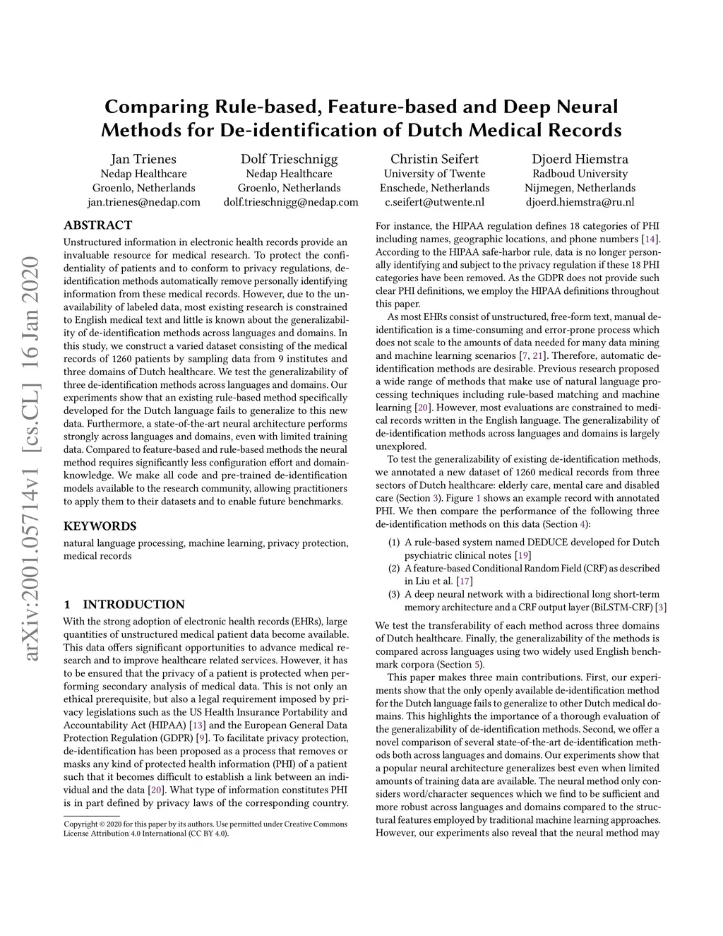 Unstructured information in electronic health records provide an invaluable resource for medical research. To protect the confidentiality of patients and to conform to privacy regulations, de-identification methods automatically remove personally identifying information from these medical records. However, due to the unavailability of labeled data, most existing research is constrained to English medical text and little is known about the generalizability of de-identification methods across languages and domains. In this study, we construct a varied dataset consisting of the medical records of 1260 patients by sampling data from 9 institutes and three domains of Dutch healthcare. We test the generalizability of three de-identification methods across languages and domains. Our experiments show that an existing rule-based method specifically developed for the Dutch language fails to generalize to this new data. Furthermore, a state-of-the-art neural architecture performs strongly across languages and domains, even with limited training data. Compared to feature-based and rule-based methods the neural method requires significantly less configuration effort and domain-knowledge. We make all code and pre-trained de-identification models available to the research community, allowing practitioners to apply them to their datasets and to enable future benchmarks.
