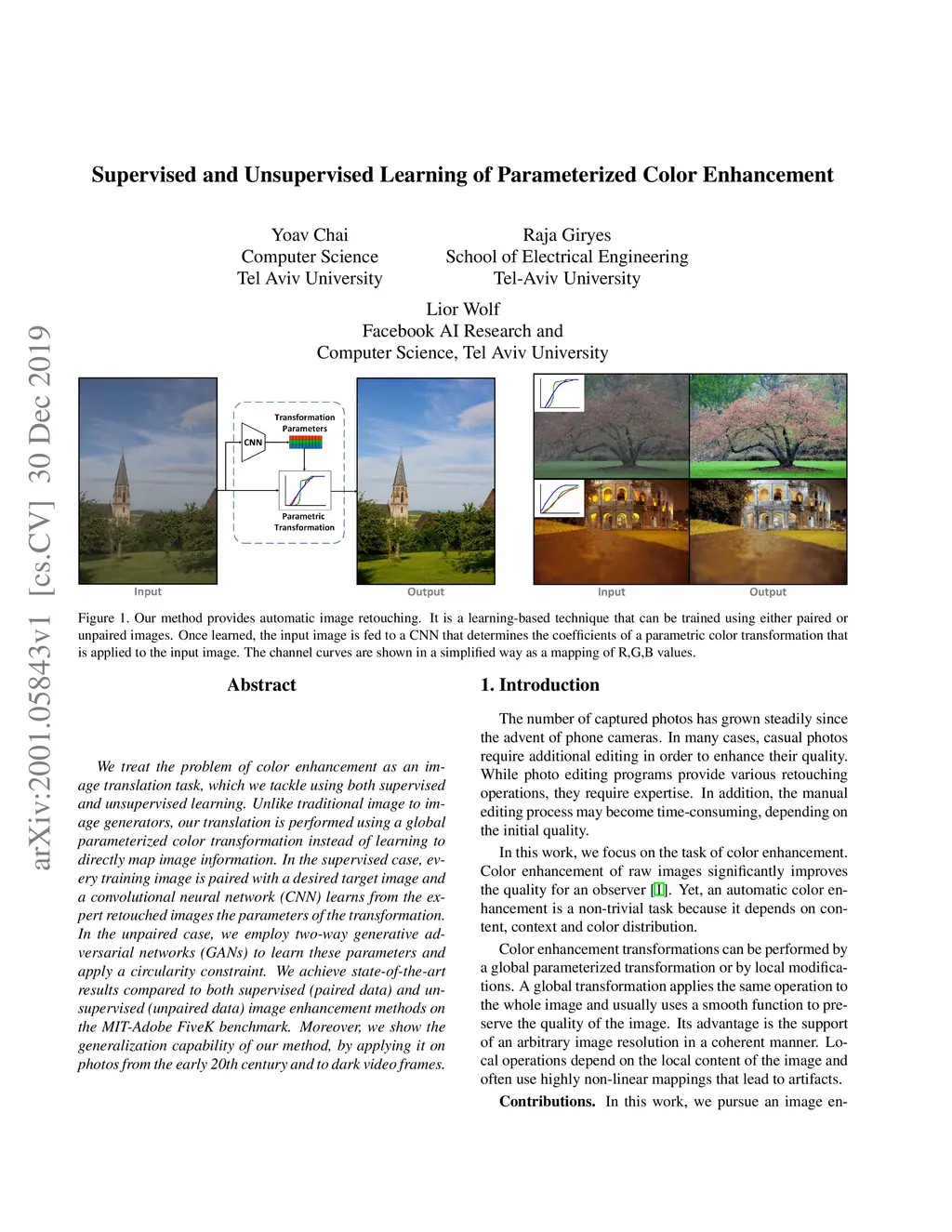 We treat the problem of color enhancement as an image translation task, which we tackle using both supervised and unsupervised learning. Unlike traditional image to image generators, our translation is performed using a global parameterized color transformation instead of learning to directly map image information. In the supervised case, every training image is paired with a desired target image and a convolutional neural network (CNN) learns from the expert retouched images the parameters of the transformation. In the unpaired case, we employ two-way generative adversarial networks (GANs) to learn these parameters and apply a circularity constraint. We achieve state-of-the-art results compared to both supervised (paired data) and unsupervised (unpaired data) image enhancement methods on the MIT-Adobe FiveK benchmark. Moreover, we show the generalization capability of our method, by applying it on photos from the early 20th century and to dark video frames.