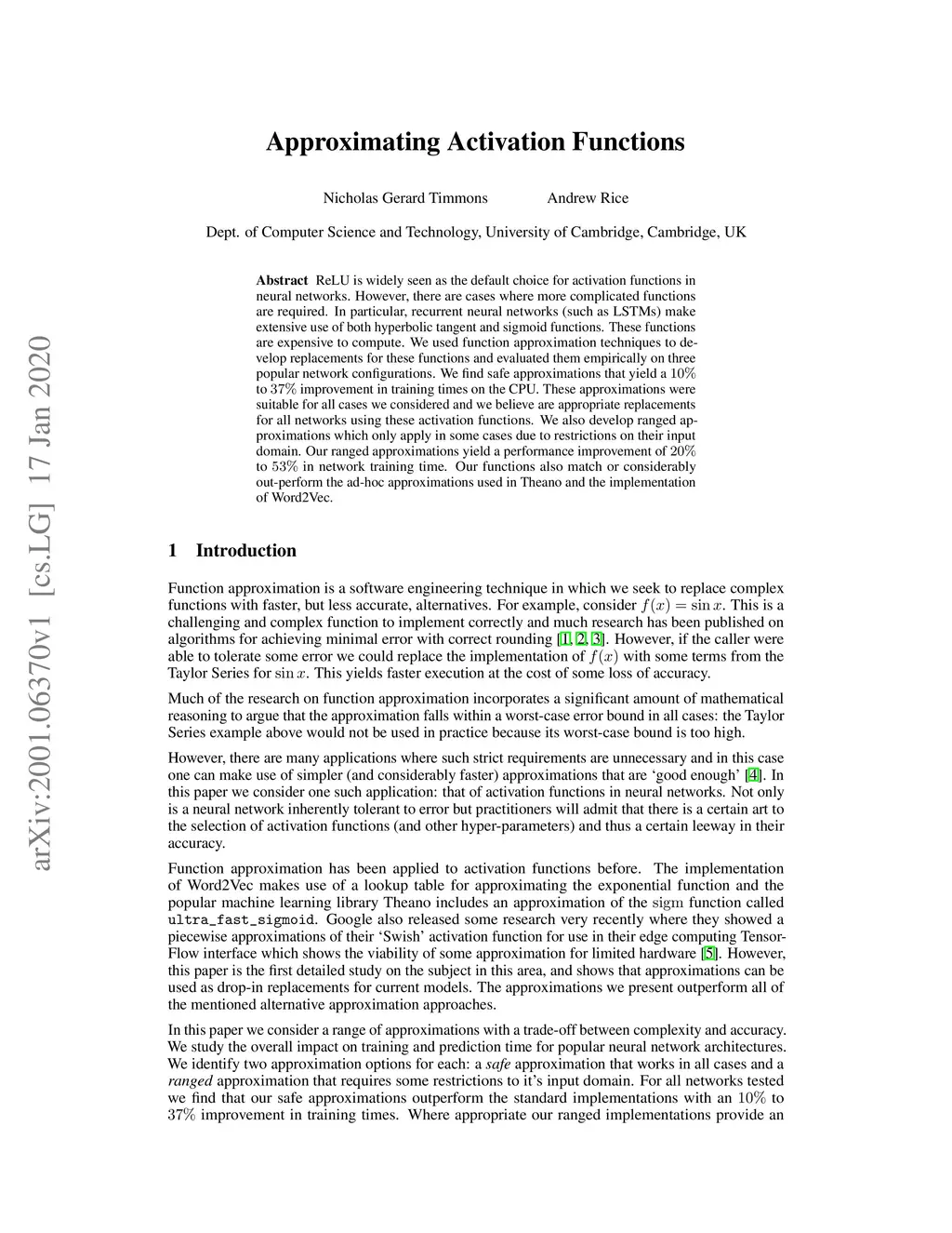 ReLU is widely seen as the default choice for activation functions in neural networks. However, there are cases where more complicated functions are required. In particular, recurrent neural networks (such as LSTMs) make extensive use of both hyperbolic tangent and sigmoid functions. These functions are expensive to compute. We used function approximation techniques to develop replacements for these functions and evaluated them empirically on three popular network configurations. We find safe approximations that yield a 10% to 37% improvement in training times on the CPU. These approximations were suitable for all cases we considered and we believe are appropriate replacements for all networks using these activation functions. We also develop ranged approximations which only apply in some cases due to restrictions on their input domain. Our ranged approximations yield a performance improvement of 20% to 53% in network training time. Our functions also match or considerably out perform the ad-hoc approximations used in Theano and the implementation of Word2Vec.