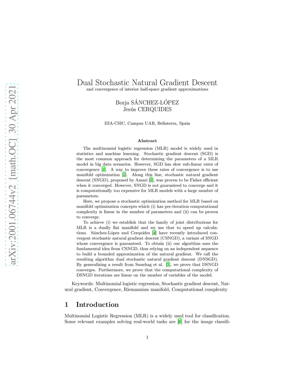 The multinomial logistic regression (MLR) model is widely used in statistics and machine learning. Stochastic gradient descent (SGD) is the most common approach for determining the parameters of a MLR model in big data scenarios. However, SGD has slow sub-linear rates of convergence. A way to improve these rates of convergence is to use manifold optimization. Along this line, stochastic natural gradient descent (SNGD), proposed by Amari, was proven to be Fisher efficient when it converged. However, SNGD is not guaranteed to converge and it is computationally too expensive for MLR models with a large number of parameters. Here, we propose a stochastic optimization method for MLR based on manifold optimization concepts which (i) has per-iteration computational complexity is linear in the number of parameters and (ii) can be proven to converge. To achieve (i) we establish that the family of joint distributions for MLR is a dually flat manifold and we use that to speed up calculations. S\ánchez-L\ópez and Cerquides have recently introduced convergent stochastic natural gradient descent (CSNGD), a variant of SNGD whose convergence is guaranteed. To obtain (ii) our algorithm uses the fundamental idea from CSNGD, thus relying on an independent sequence to build a bounded approximation of the natural gradient. We call the resulting algorithm dual stochastic natural gradient descent (DNSGD). By generalizing a result from Sunehag et al., we prove that DSNGD converges. Furthermore, we prove that the computational complexity of DSNGD iterations are linear on the number of variables of the model.
