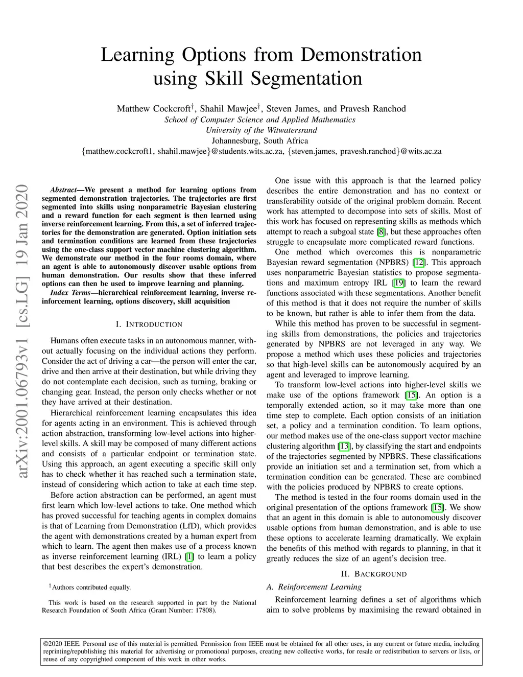 We present a method for learning options from segmented demonstration trajectories. The trajectories are first segmented into skills using nonparametric Bayesian clustering and a reward function for each segment is then learned using inverse reinforcement learning. From this, a set of inferred trajectories for the demonstration are generated. Option initiation sets and termination conditions are learned from these trajectories using the one-class support vector machine clustering algorithm. We demonstrate our method in the four rooms domain, where an agent is able to autonomously discover usable options from human demonstration. Our results show that these inferred options can then be used to improve learning and planning.
