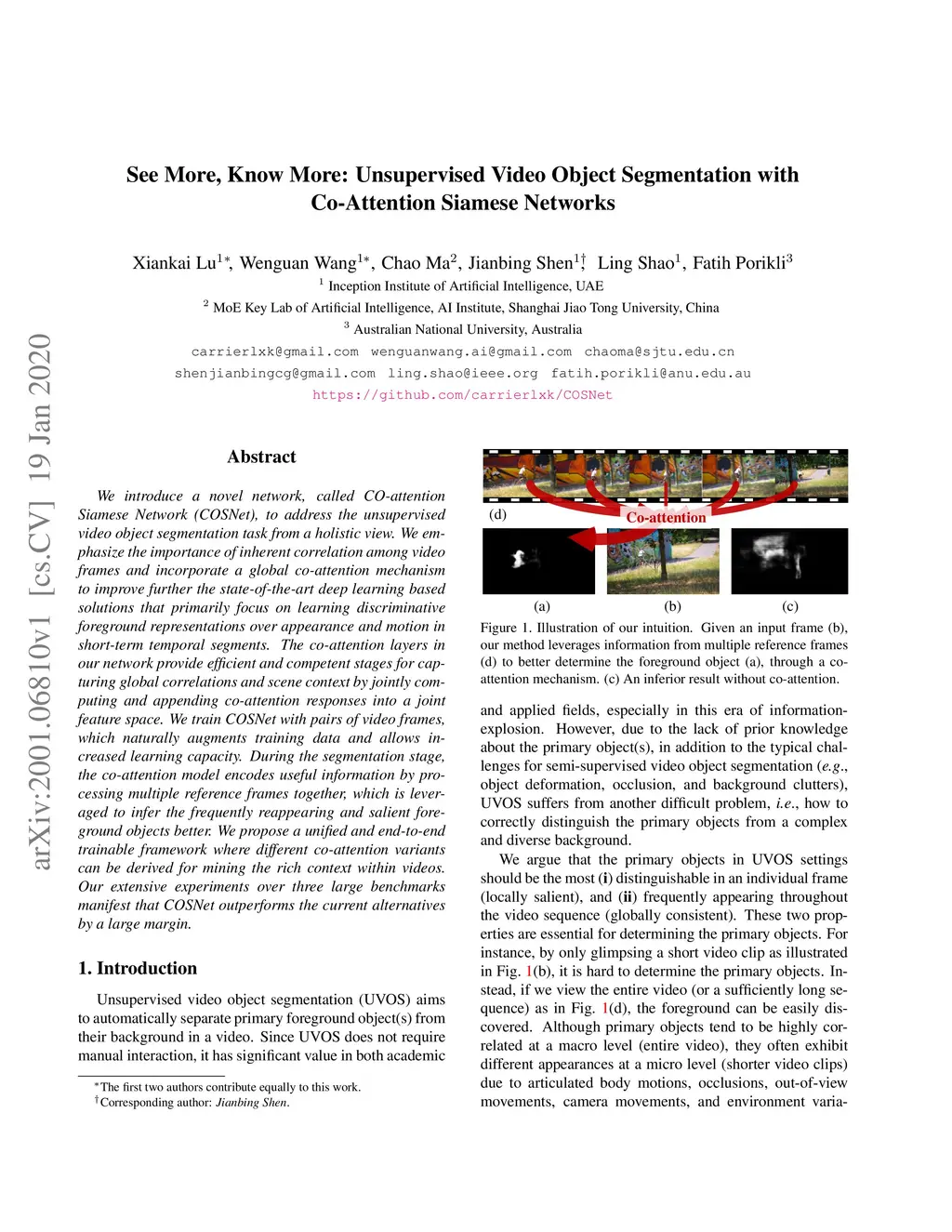 We introduce a novel network, called CO-attention Siamese Network (COSNet), to address the unsupervised video object segmentation task from a holistic view. We emphasize the importance of inherent correlation among video frames and incorporate a global co-attention mechanism to improve further the state-of-the-art deep learning based solutions that primarily focus on learning discriminative foreground representations over appearance and motion in short-term temporal segments. The co-attention layers in our network provide efficient and competent stages for capturing global correlations and scene context by jointly computing and appending co-attention responses into a joint feature space. We train COSNet with pairs of video frames, which naturally augments training data and allows increased learning capacity. During the segmentation stage, the co-attention model encodes useful information by processing multiple reference frames together, which is leveraged to infer the frequently reappearing and salient foreground objects better. We propose a unified and end-to-end trainable framework where different co-attention variants can be derived for mining the rich context within videos. Our extensive experiments over three large benchmarks manifest that COSNet outperforms the current alternatives by a large margin.