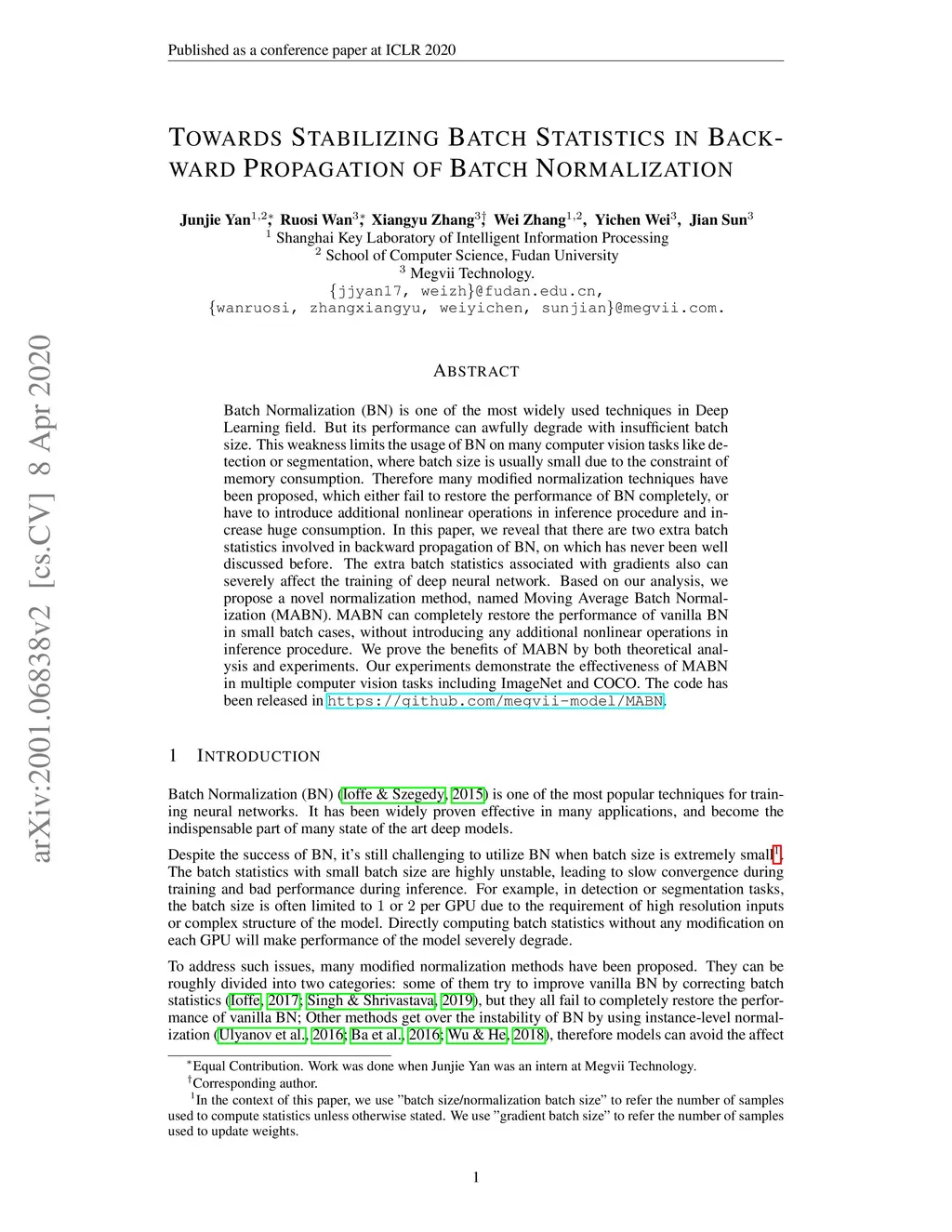 Batch Normalization (BN) is one of the most widely used techniques in Deep Learning field. But its performance can awfully degrade with insufficient batch size. This weakness limits the usage of BN on many computer vision tasks like detection or segmentation, where batch size is usually small due to the constraint of memory consumption. Therefore many modified normalization techniques have been proposed, which either fail to restore the performance of BN completely, or have to introduce additional nonlinear operations in inference procedure and increase huge consumption. In this paper, we reveal that there are two extra batch statistics involved in backward propagation of BN, on which has never been well discussed before. The extra batch statistics associated with gradients also can severely affect the training of deep neural network. Based on our analysis, we propose a novel normalization method, named Moving Average Batch Normalization (MABN). MABN can completely restore the performance of vanilla BN in small batch cases, without introducing any additional nonlinear operations in inference procedure. We prove the benefits of MABN by both theoretical analysis and experiments. Our experiments demonstrate the effectiveness of MABN in multiple computer vision tasks including ImageNet and COCO. The code has been released in https://github.com/megvii-model/MABN.